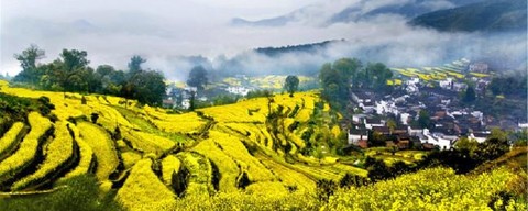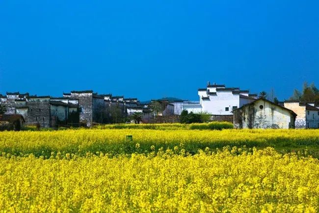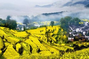 江西婺源的油菜花就是这样一种意韵。婺源被誉为"中国最美的乡村",婺源最美的季节是油菜花开放的时候。三月中下旬,棵棵粉红的桃花、洁白的梨花点缀在漫山遍野金黄色的油菜花中,掩映着白墙灰瓦的徽派建筑,使得每一个逃离纷繁城市的人都能找到归宿。
