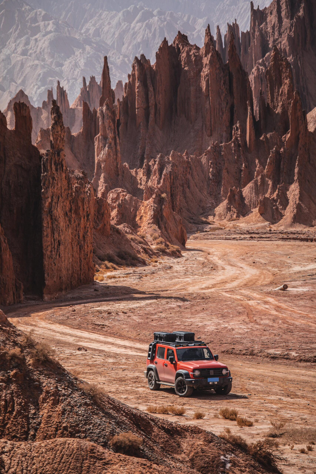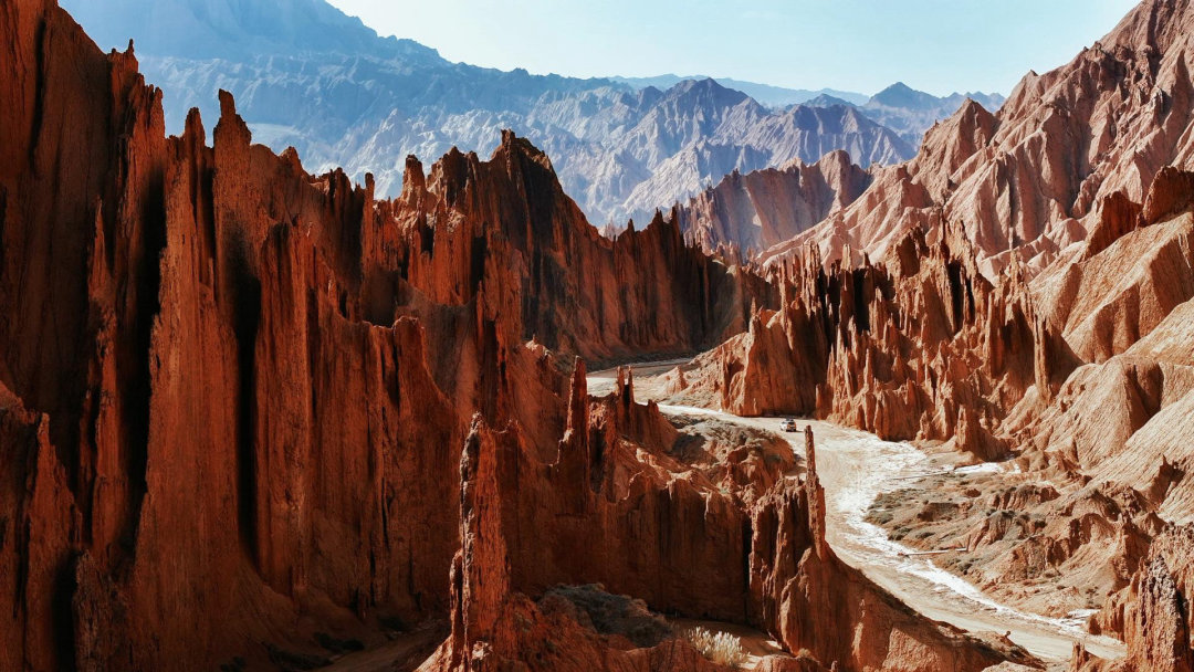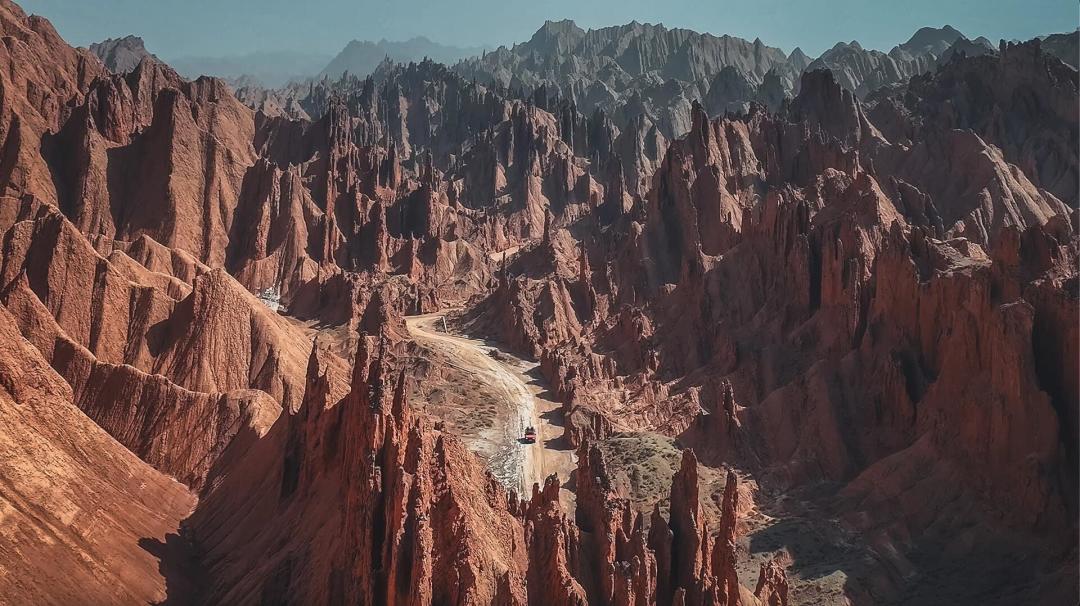 库车藏着地球最狂野的伤口,这片未被导航地图收编的红石林,全靠经验才能才到入口。与传统的蜿蜒峡谷不同,岩石像骑士手中的剑,棱角分明,一根根威严的伫立在你眼前。当你穿越这魔鬼般的红山石林,那一瞬间仿佛误入了“西部世界”。
