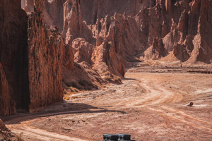 往前继续行驶,一片格格不入的【红石林】进入眼帘,这里像被世人遗忘的奇异星球。我们摆脱常规游客打卡的库车天山大峡谷,选择带大家闯进这个异域世界,感受里面的魔幻。要想进入一窥究竟,还需要来一段河谷穿越,才能打开隐藏其中的入口通道。