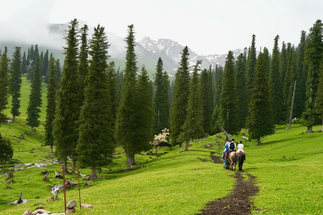 牧道穿越抵达【库尔德宁草原】,这里是雪岭云杉保护区,拥有国内最大的原始云杉林。伊犁的草原风景区都是处在东西走向的河谷地带,唯独库尔德宁是在一条南北走向的山间阔谷。库尔德宁便是哈萨克语“横沟”的意思。在这里可以穿梭森林,沿着河边骑马,沉浸式感受大自然的美妙。