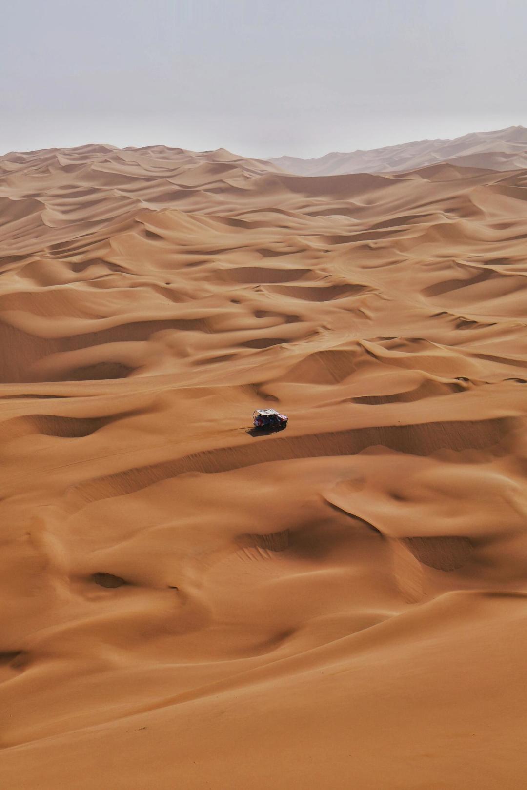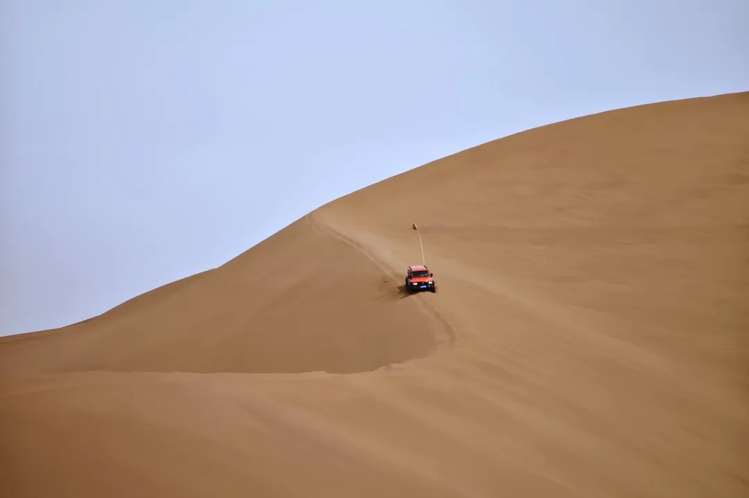 穿越了草原、森林、石林,在新疆怎么可以错过沙漠。车身以45度角俯冲向沙谷,失重感让心跳撞破胸腔,你还没回魂,再冲上沙峰之巅,连续穿越悬崖般的沙峰,这不是简单的越野,而是用肾上腺素在沙海中书写狂草。