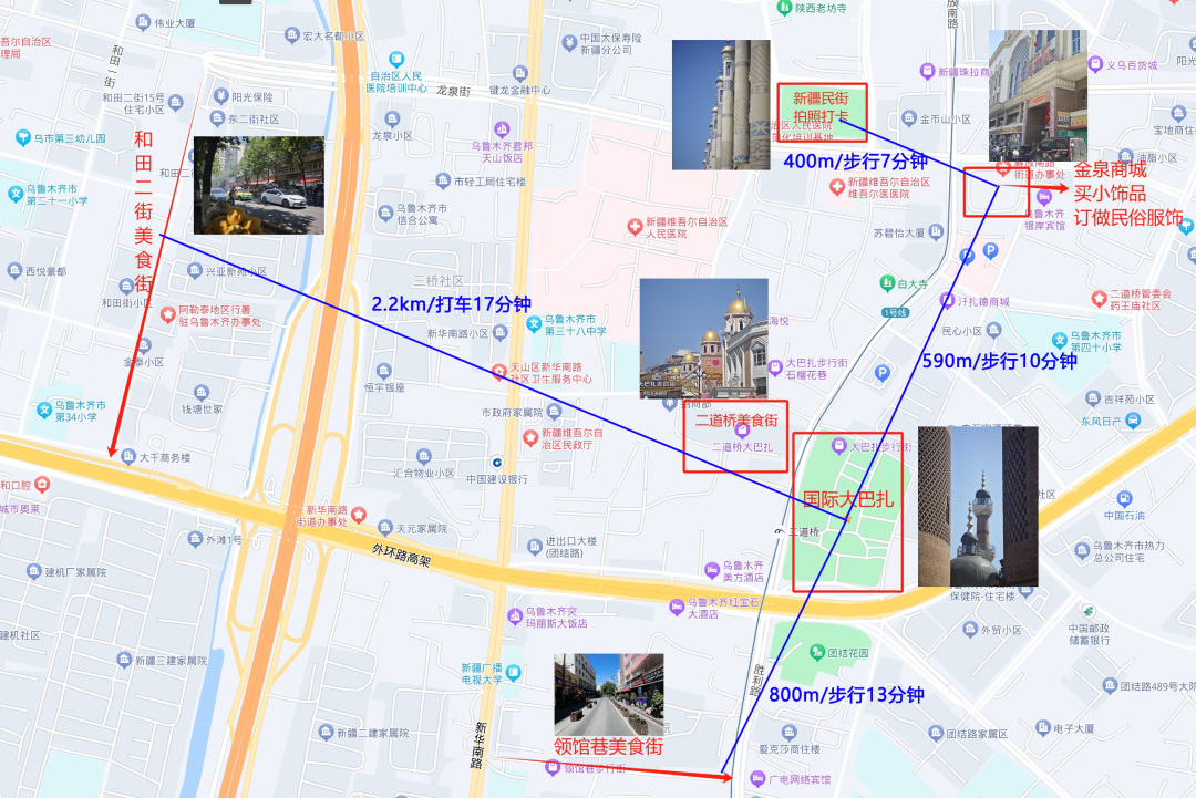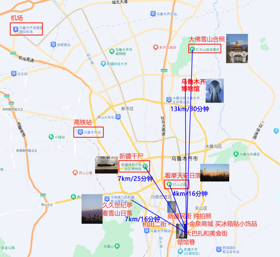 4.乌鲁木齐市区游览推荐:国际大巴扎、新疆维吾尔自治区博物馆(提前在“新疆维吾尔自治区博物馆”微信公众号或小程序自行预约,周一闭馆)、红山公园等