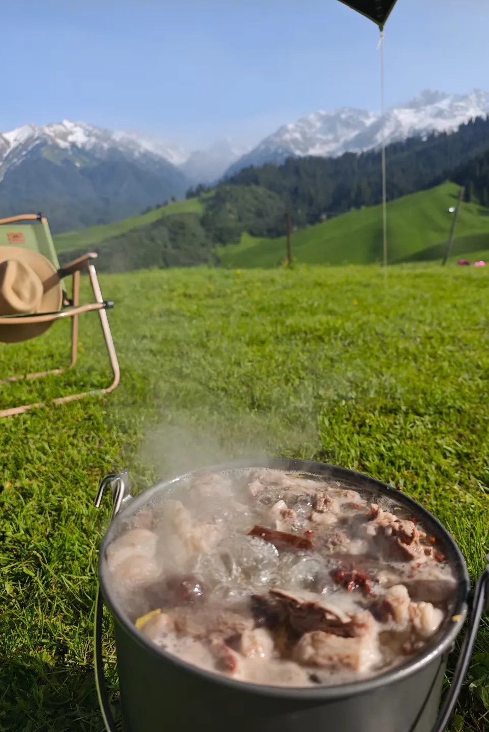 今天的用餐,我们直接在牧道原地扎营,一起动手烹煮提前准备好的食材,一边尝美食一边赏美景,这可跟你在家附近的公园野餐不是一个级别,是足以让人羡慕的高奢玩法。