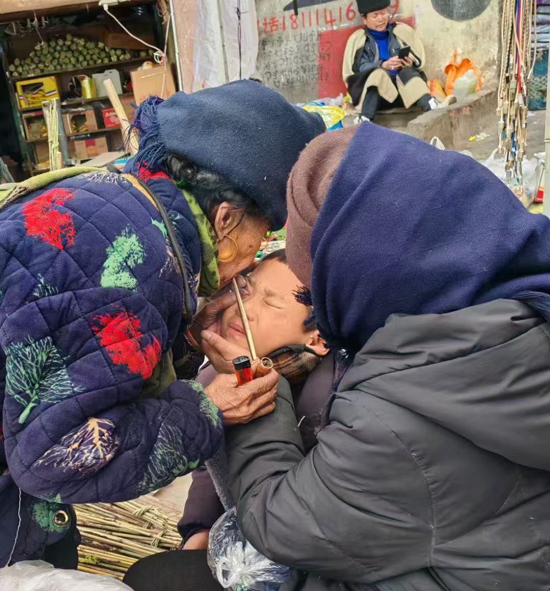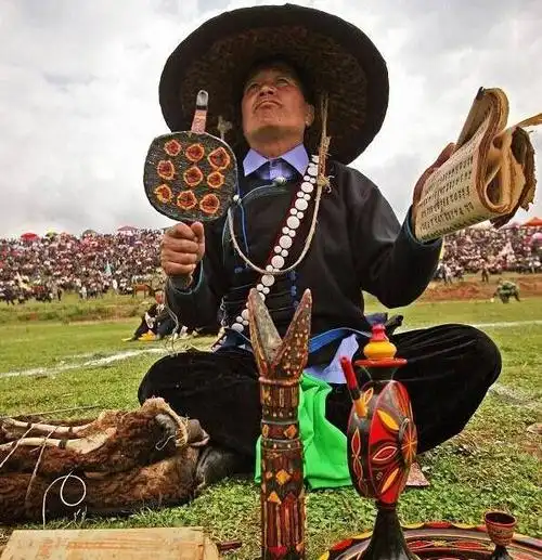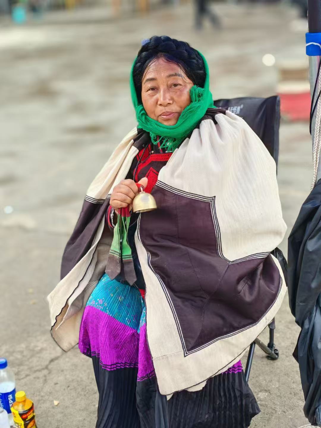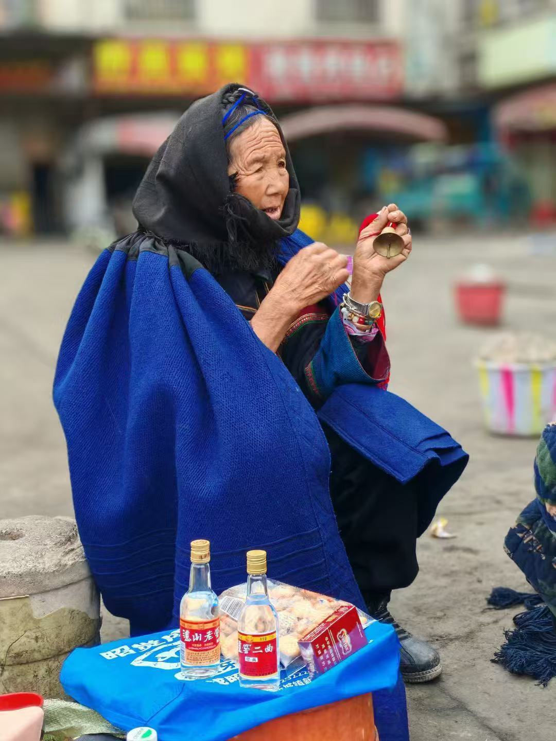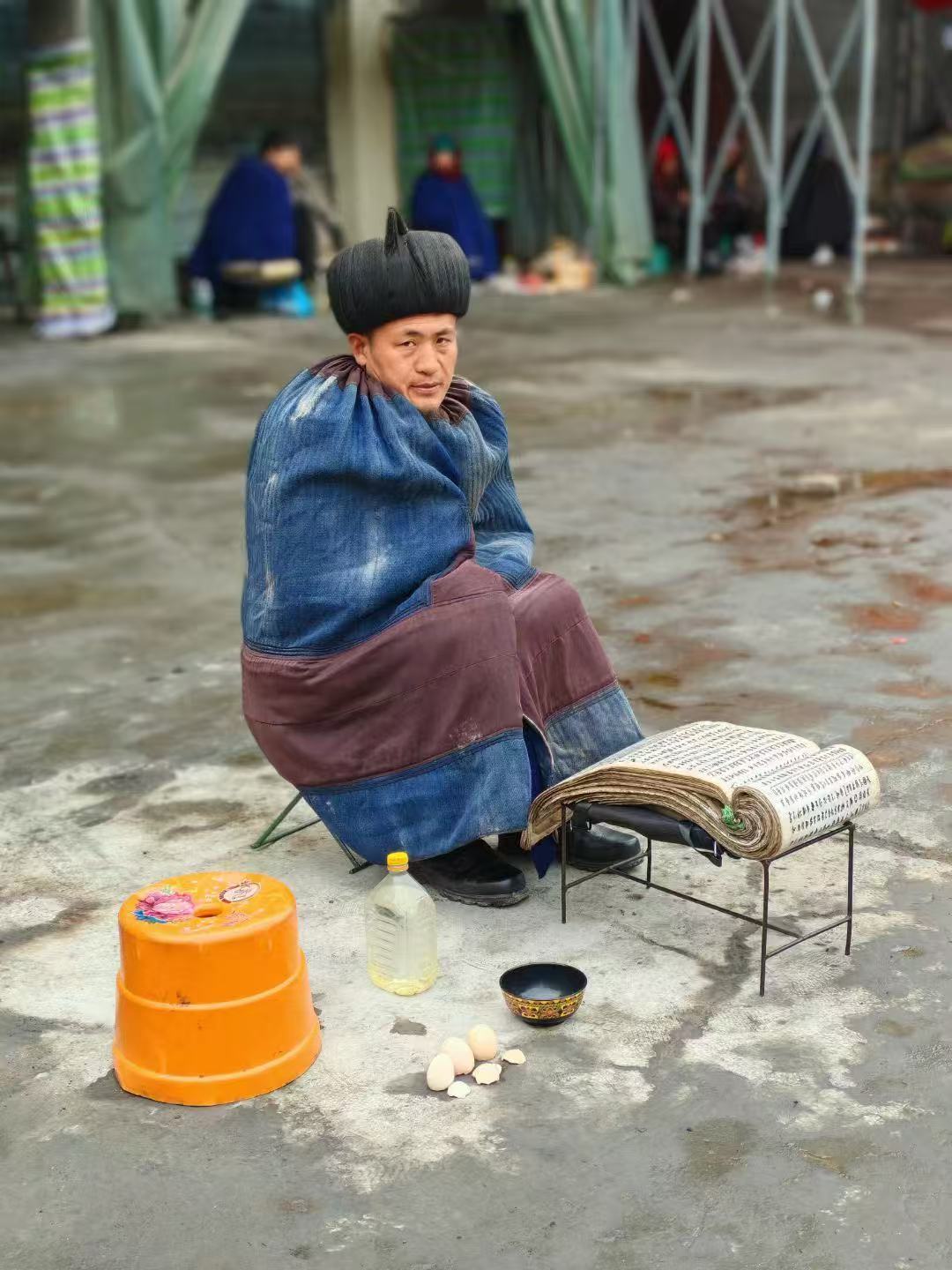 在昭觉县城,有这么一个小广场上,穿着彝族服饰的老人们支个小小摊,两个小矮凳,一大本写有我们看不懂的彝文圣书,鸡蛋几个,小碗1个,酒小瓶,一个鼓,一串铃铛等。这是彝族独有的毕摩文化。他们在用独有的方式,为彝族人民解惑心中的烦恼。