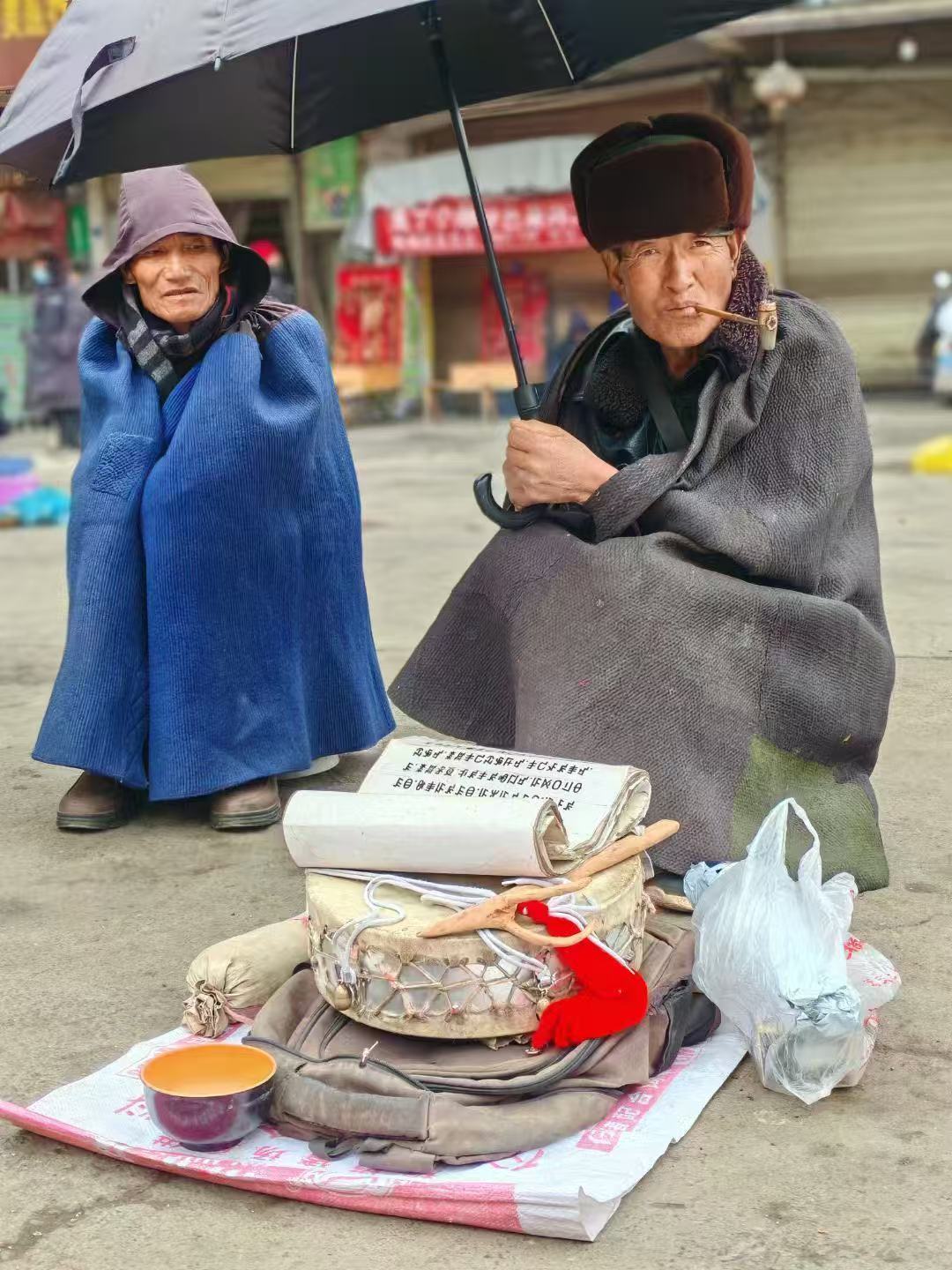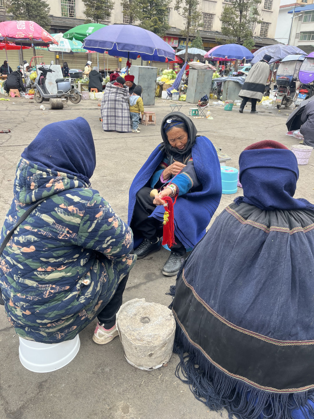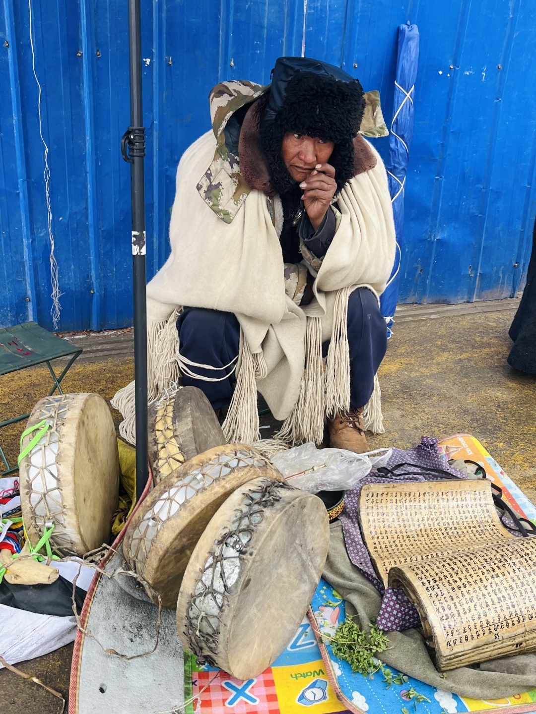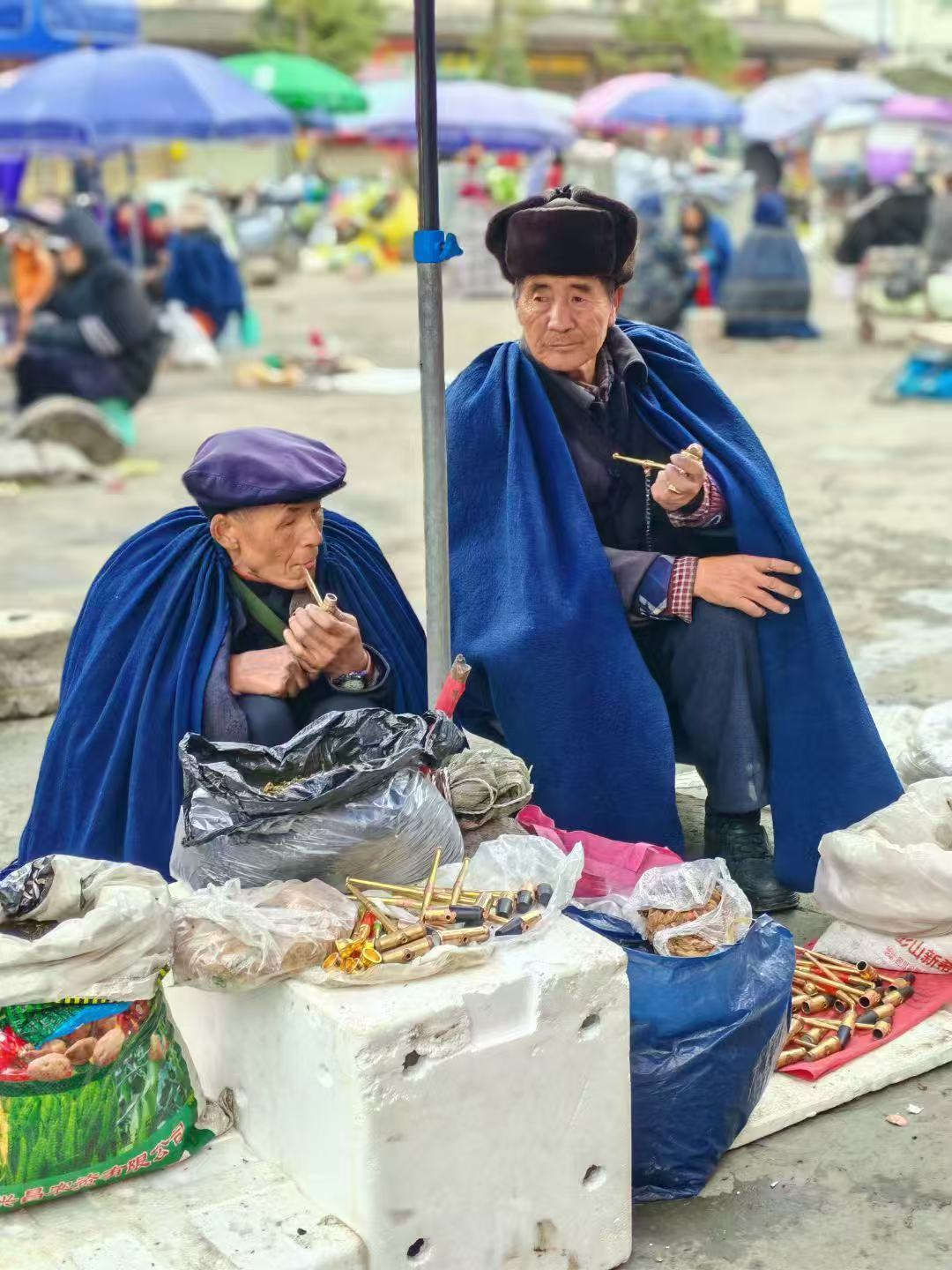 在昭觉县城,有这么一个小广场上,穿着彝族服饰的老人们支个小小摊,两个小矮凳,一大本写有我们看不懂的彝文圣书,鸡蛋几个,小碗1个,酒小瓶,一个鼓,一串铃铛等。这是彝族独有的毕摩文化。他们在用独有的方式,为彝族人民解惑心中的烦恼。
