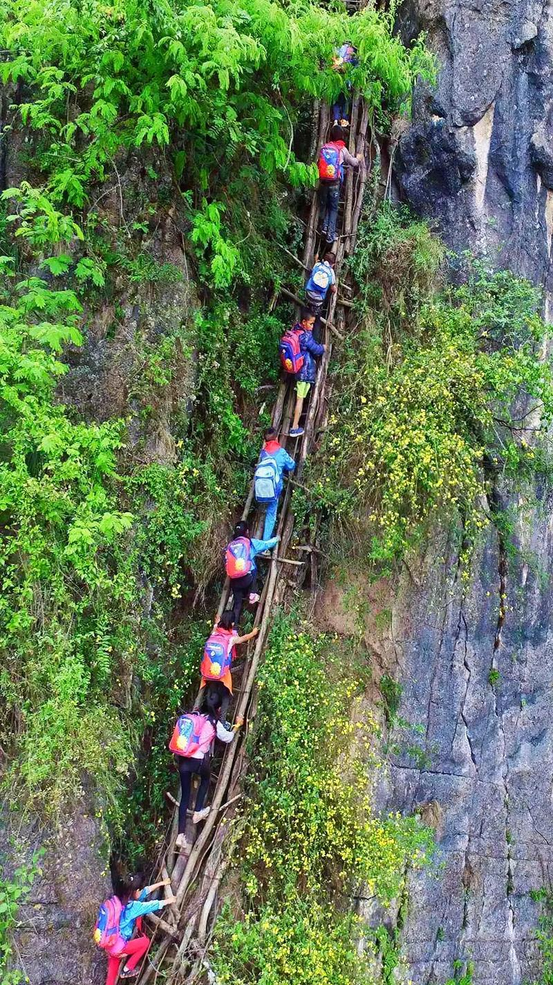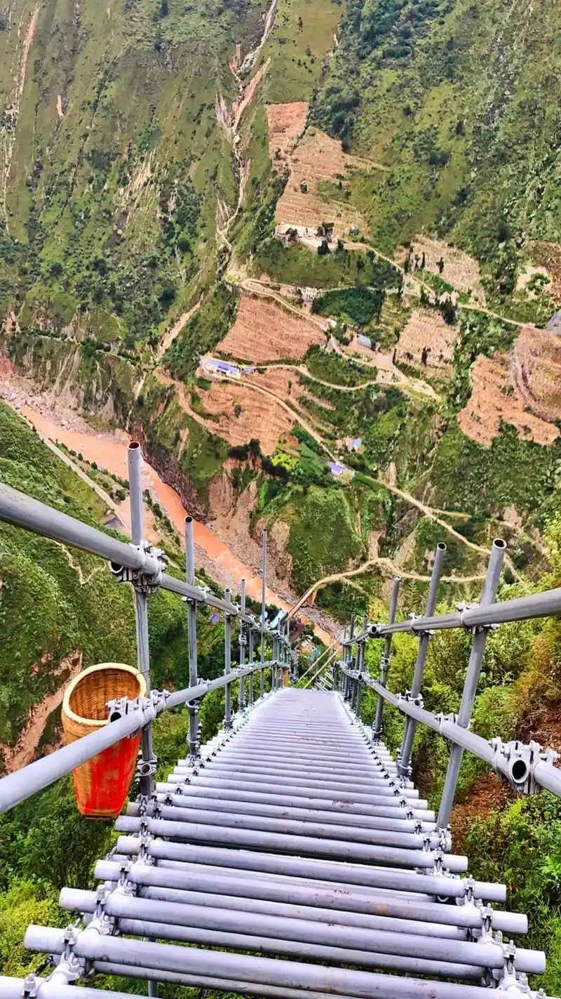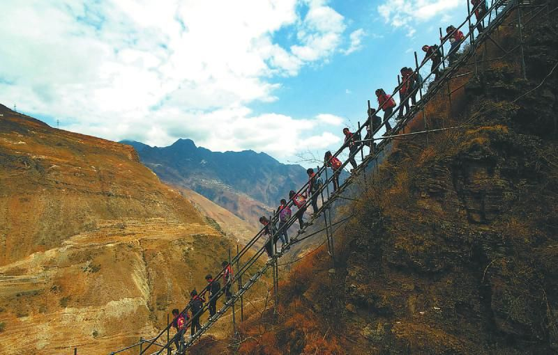 200多年前,四川凉山彝族人为躲避战乱,在海拔约2000多米山坳中建起阿土列尔村(悬崖村),位于四川凉山州昭觉县,这里悬崖峭壁,地势陡峭,垂直落差有1000多米,村民出行唯一的途径,只有眼前这条钢管结构云梯,在没有钢管云梯之前,村民走出“悬崖村“购买生活用品都非难。需要顺爬17条藤梯才能到达山下,孩子们为了能上学都需要花几个小时攀爬去往学校。