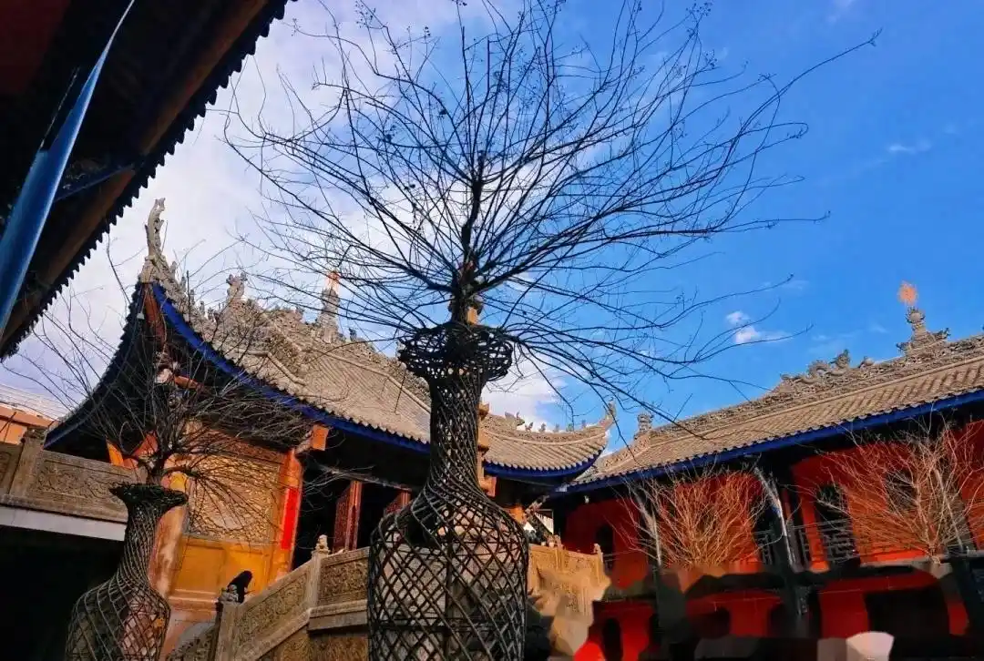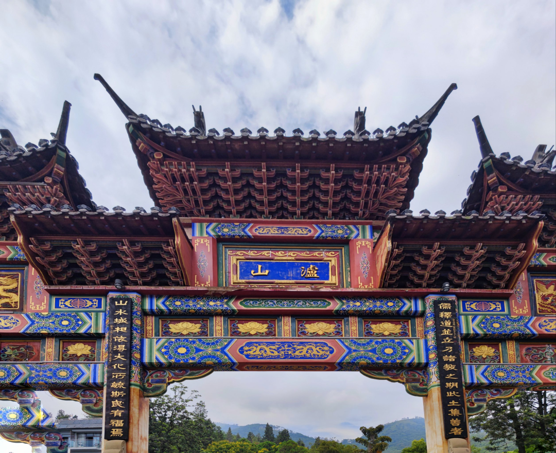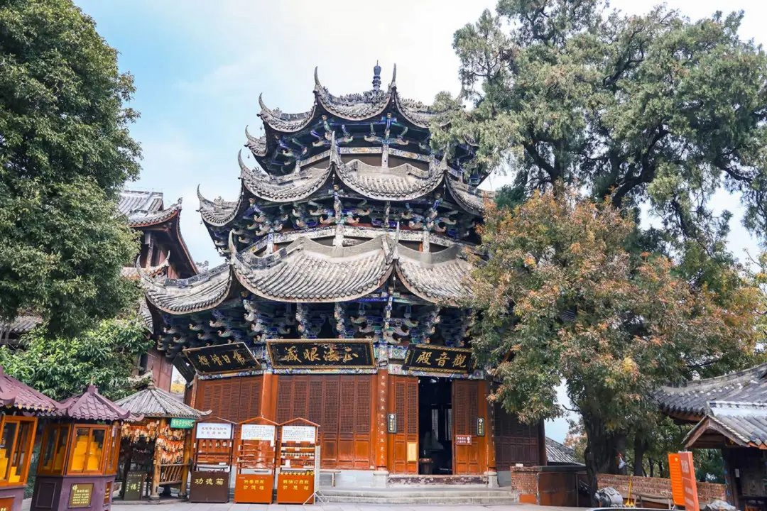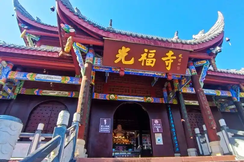 光福寺是泸山宗教建筑中历史最久、规模最大、香火最旺的佛教主庙,它始建于唐天佑年间,整个建筑群依照山体的走势而建设。光福寺左侧树上挂着布幡,寺庙正中央的匾额上面写着“光福寺”三个大字,几根朱红色的立柱支撑着整座寺庙,横着的梁柱上面雕刻着吉祥的图案,飞檐翘脚的建筑特色极具轻盈之感。