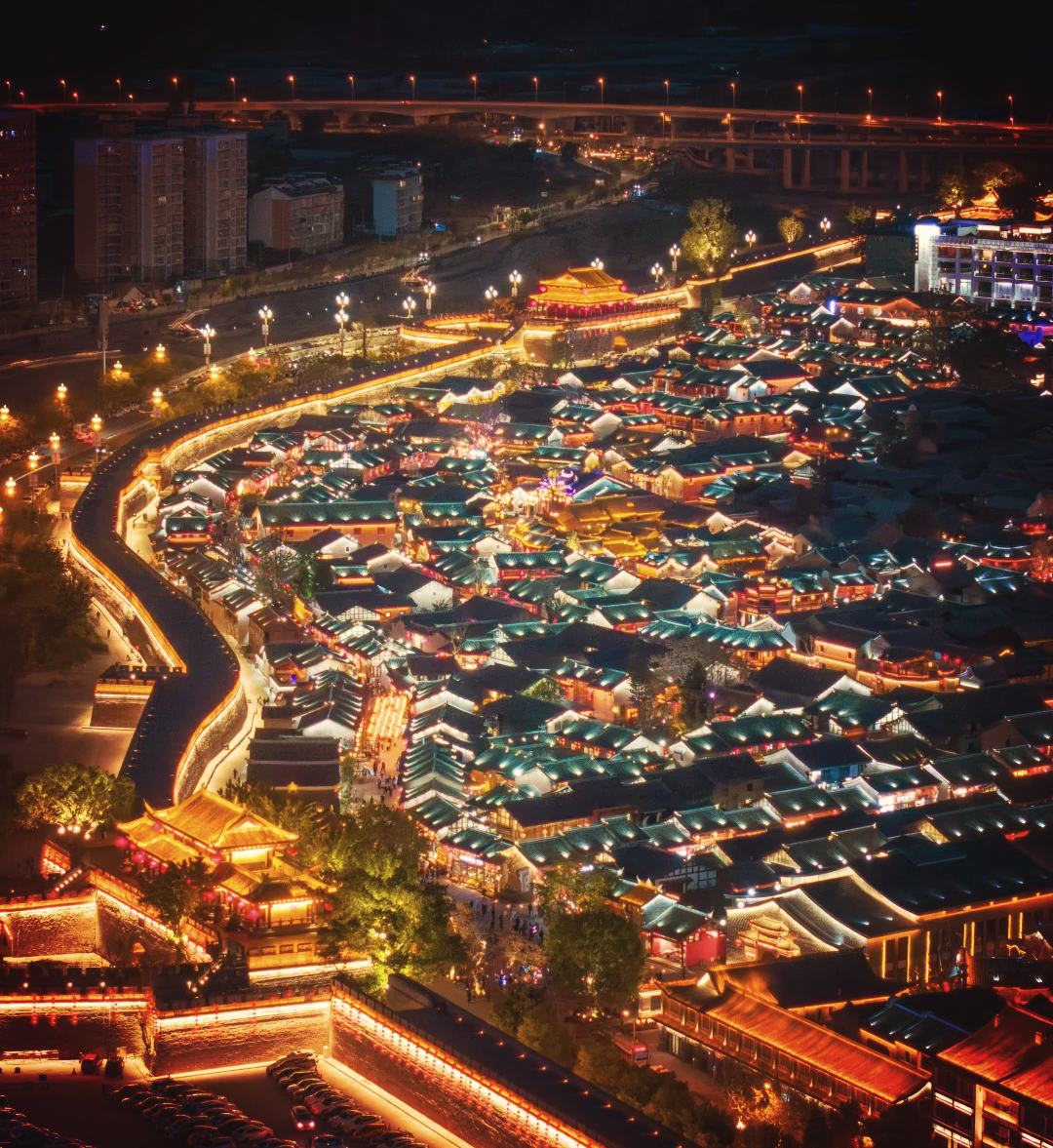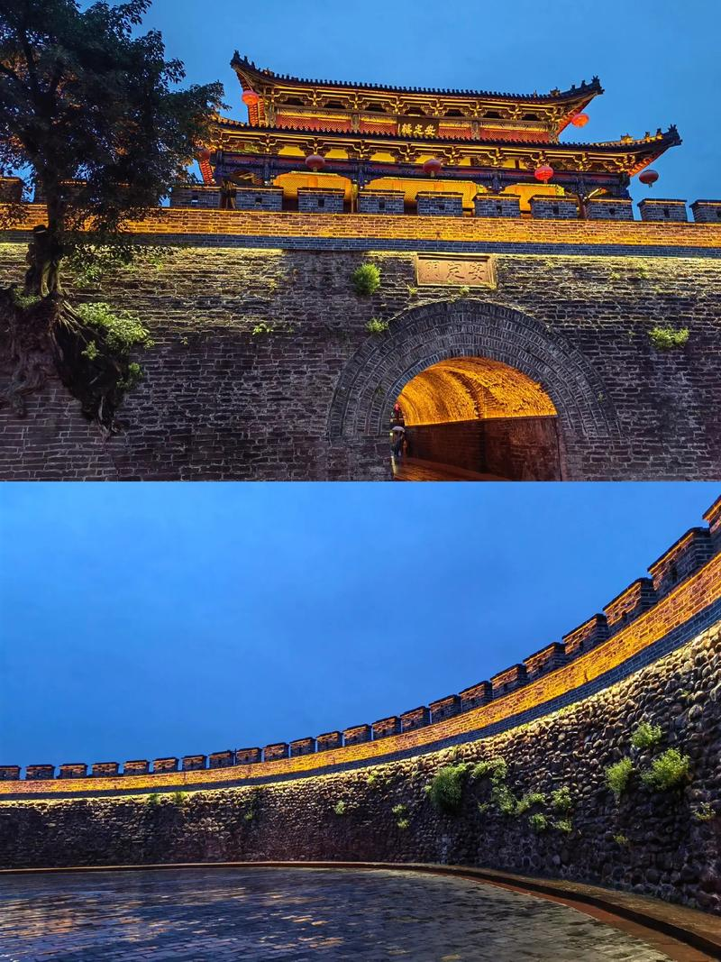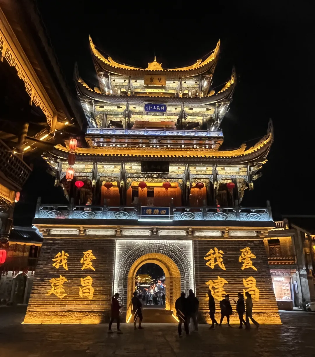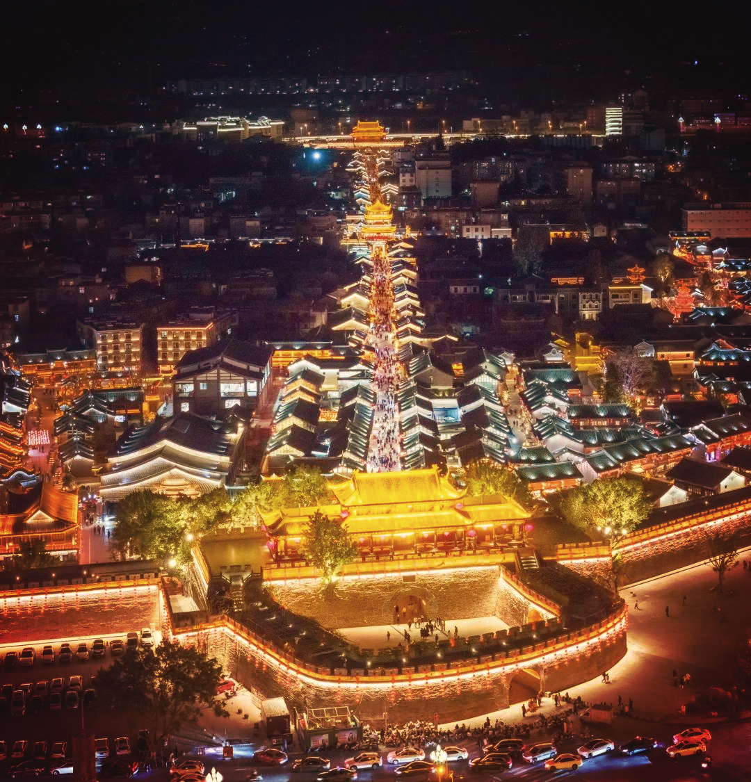 【建昌古城】夜景,城门城楼城墙,九街十八巷,以四牌楼为中心,夜晚灯光亮起格外醒目,可在此感受古城的历史韵味和现代灯光交织的独特氛围。晚上可在古城美食街品尝彝家美食小吃(游玩+自由晚餐约2.5小时)