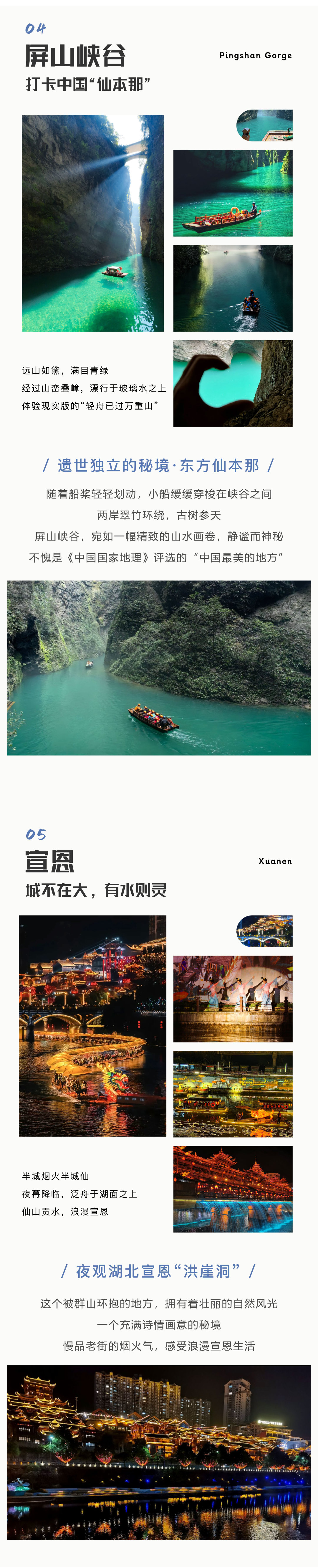 我们乘车前往【屏山峡谷】(车程约2.5 小时,游览约4 小时),屏山峡谷被誉 为“中国仙本那”,这里是恩施旅游必览之地。