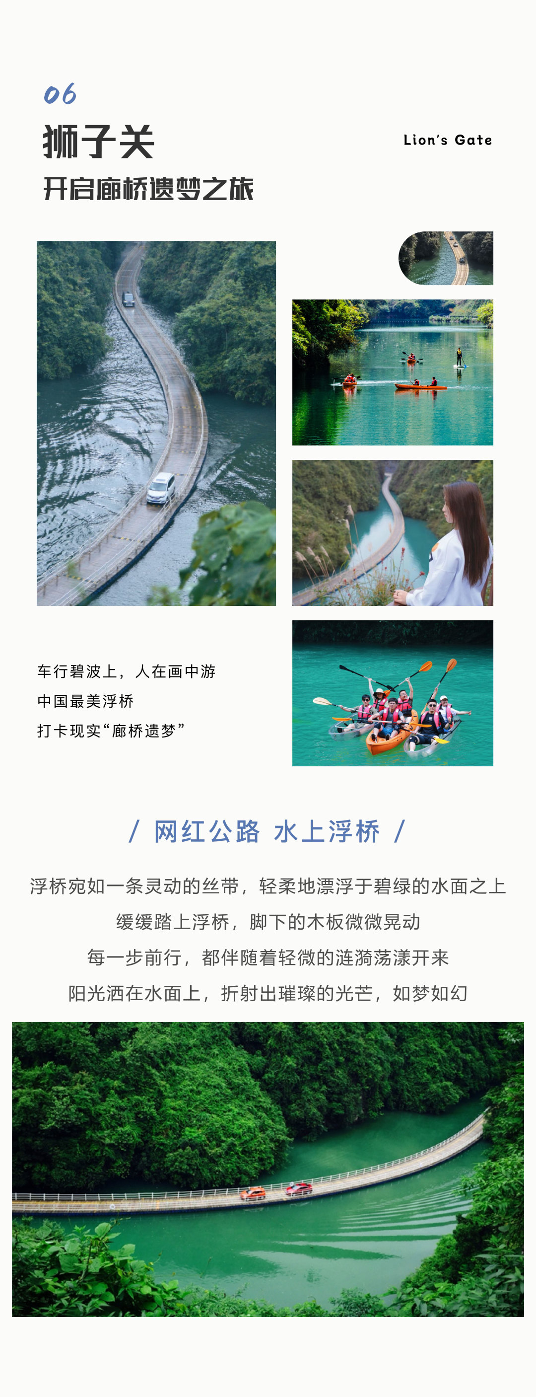 早上,早餐后,我们前往狮子关景区。踏入景区,首先映入眼帘的便是那令人称奇的水上浮桥 ——“廊桥遗梦”。这座蜿蜒于碧水之上的浮桥,随着水波轻轻荡漾,仿若一条灵动的绸带飘落在湖面。当车辆缓缓驶过,浮桥泛起层层涟漪,与周边的青山绿水相互映衬,形成一幅动静相宜的绝美画面。