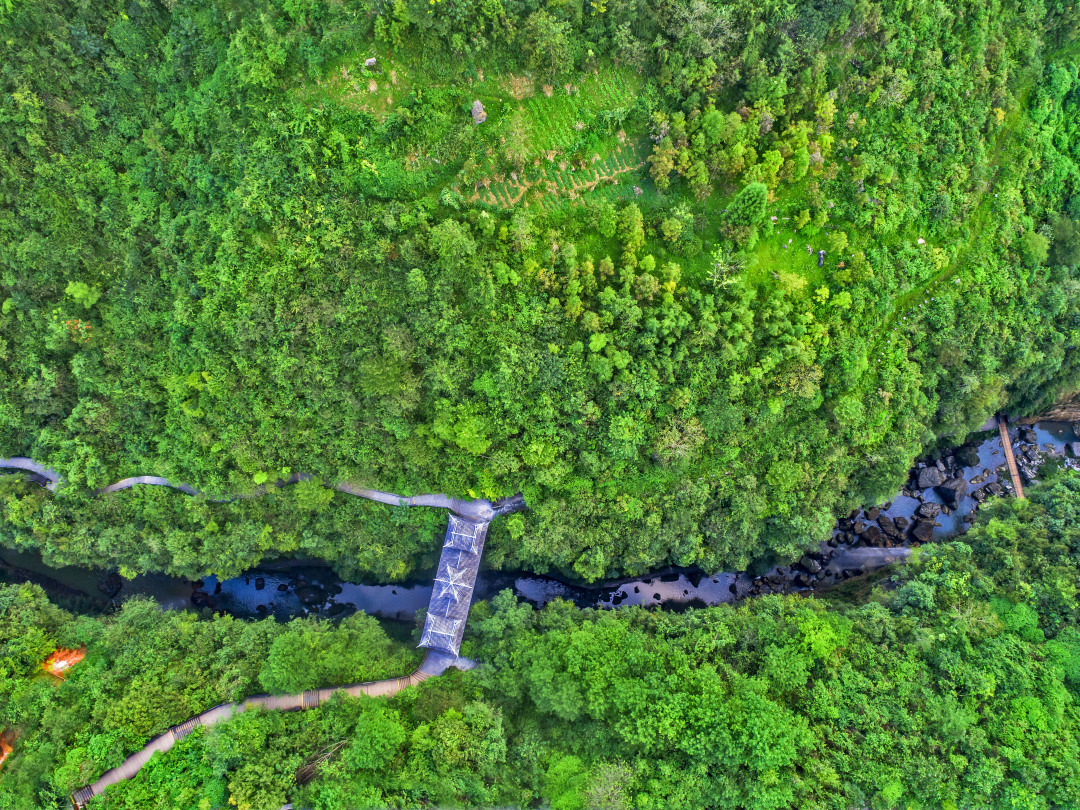 沿着四周峭壁凌空高悬的栈道向下缓行,青山连绵起伏,满目翠绿欲滴,那是大自然用最细腻的笔触勾勒的生机画卷;