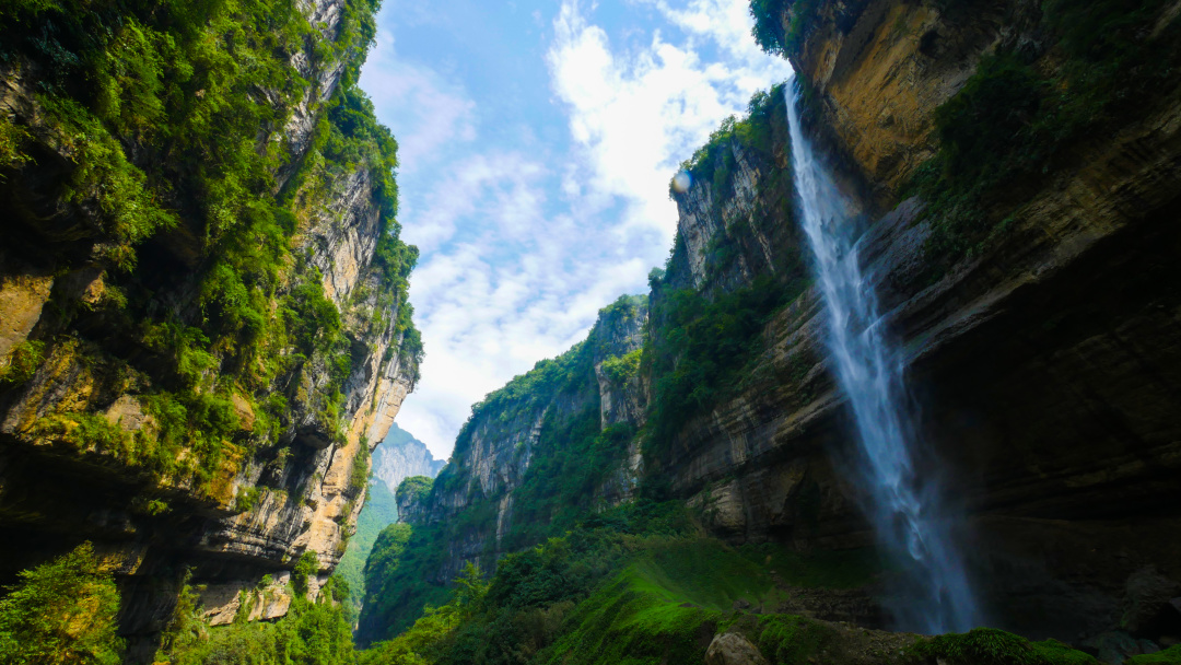 两岸峭壁似巨人拔地而起,笔直陡峭,近得仿佛触手可得。船行向前,天空渐窄,只剩一线湛蓝,仿若时空压缩,阳光挤入,在水面洒下金色光斑,如梦似幻。