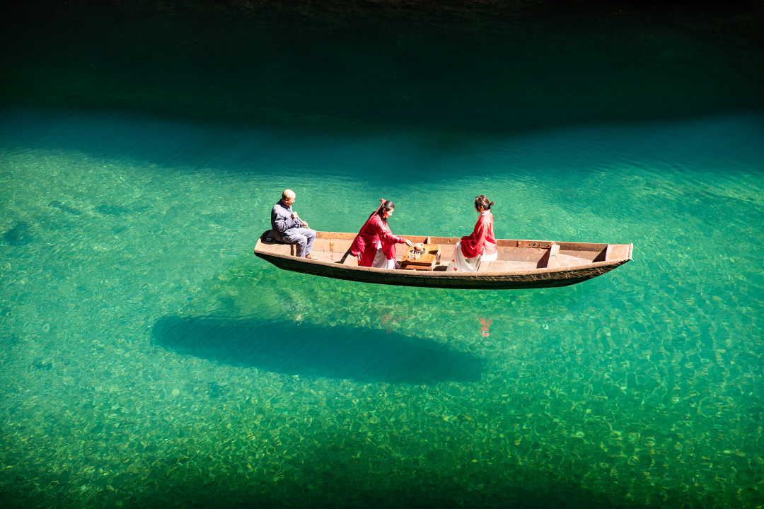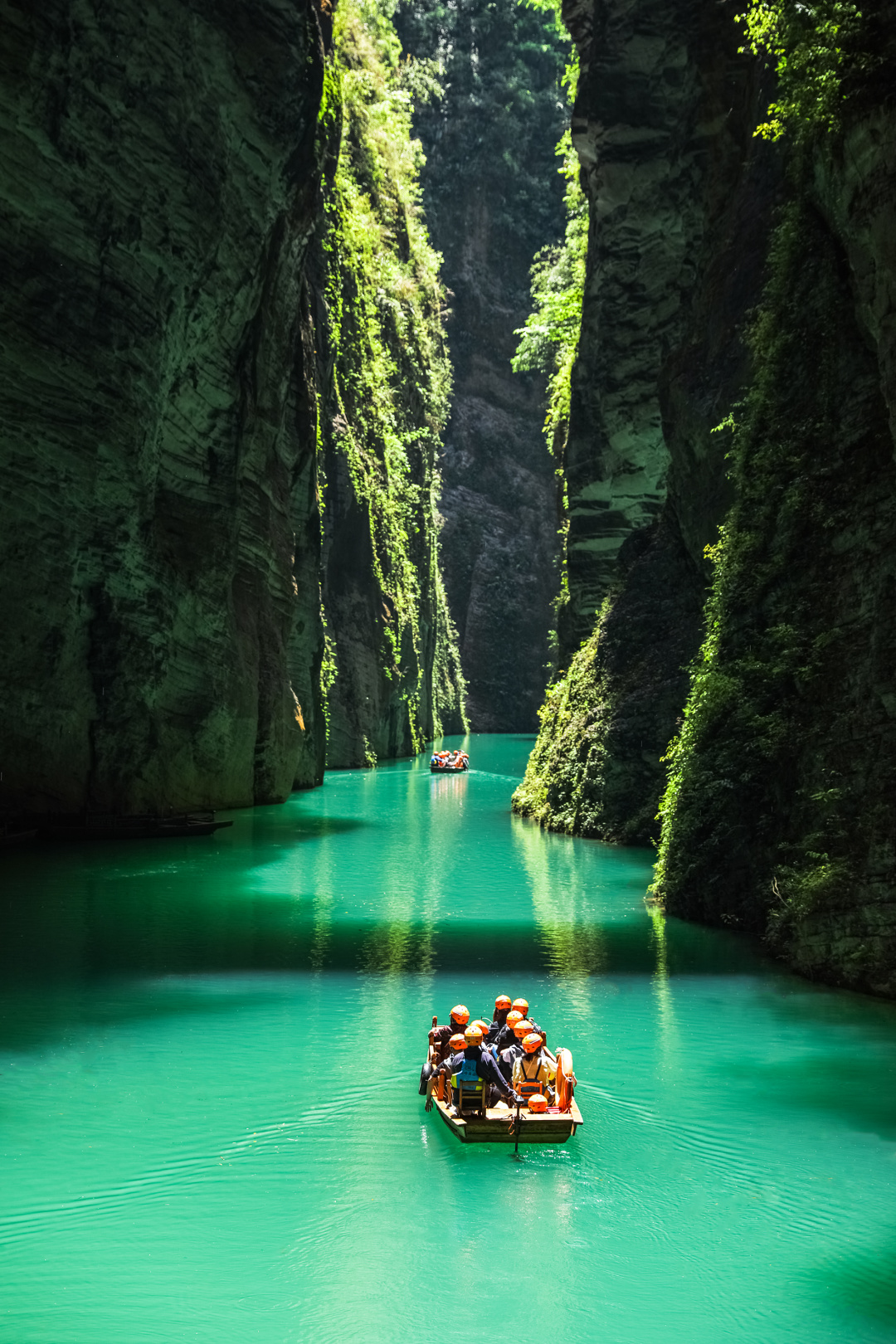 当抵达峡谷底部,便是本次行程的高光时刻 —— 网红「漂浮小船」体验。轻轻踏上小船,瞬间仿若踏入了世外桃源,悠悠飘荡在碧水青山之间。