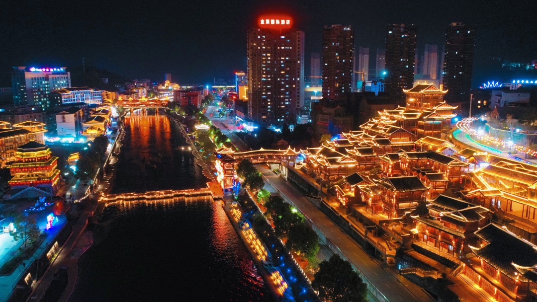 华灯初上,宣恩贡水河两岸瞬间被点亮,五彩斑斓的灯光交织辉映,宛如一条流动的梦幻星河坠入凡间。沿着河畔漫步,微风轻拂,带来丝丝凉意,风中似乎还裹挟着这座城市的烟火气息与历史韵味。