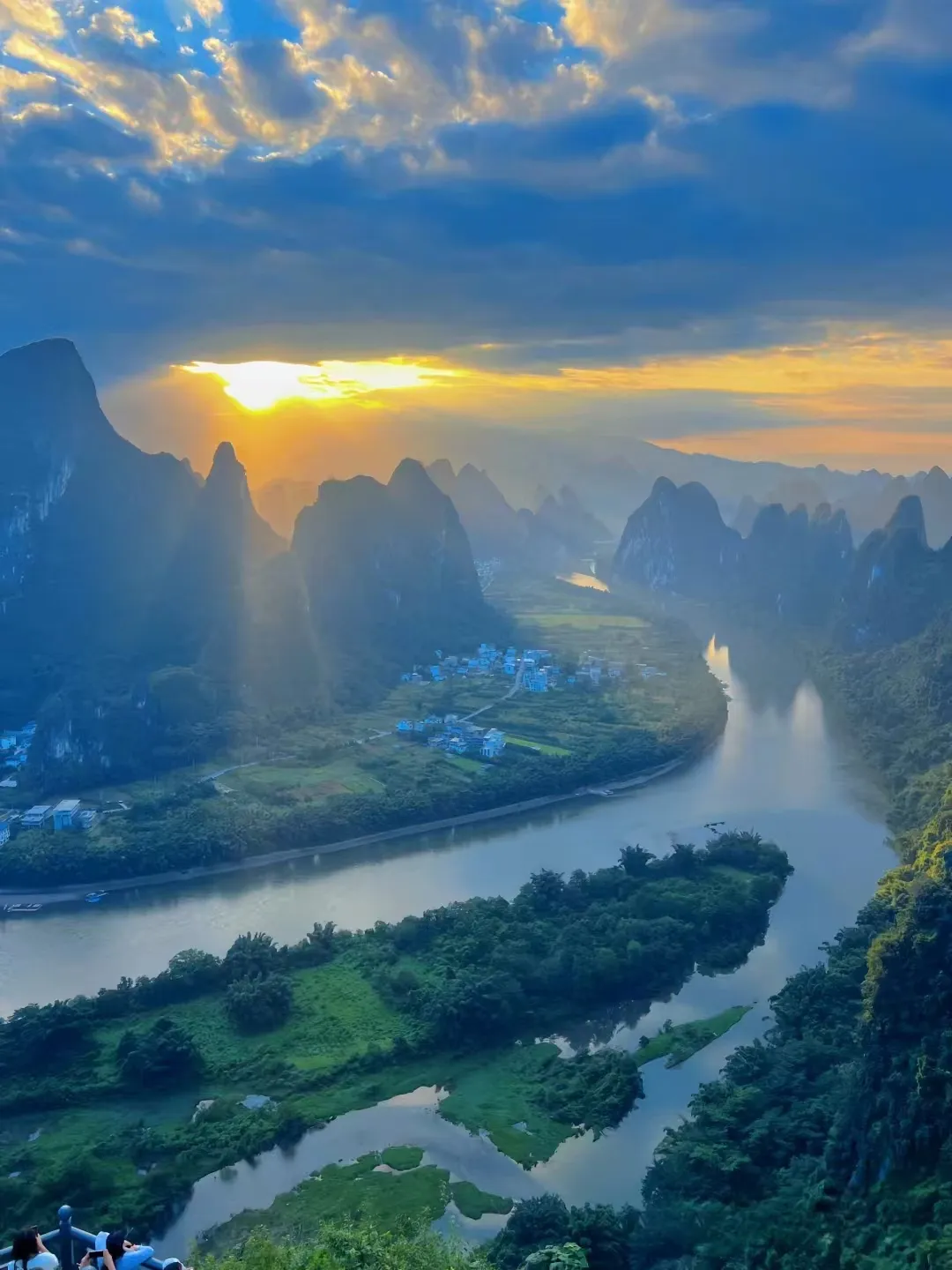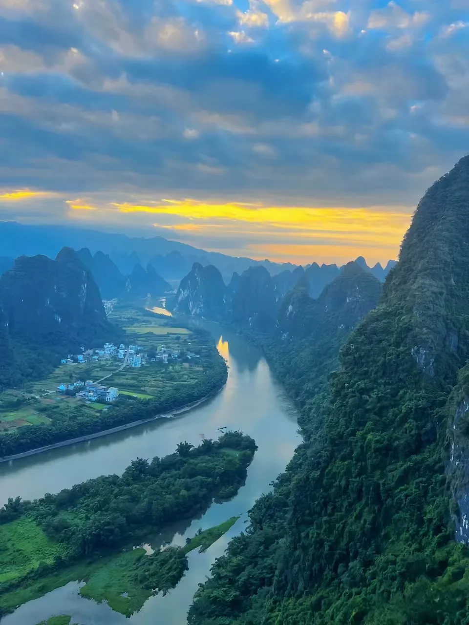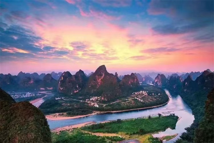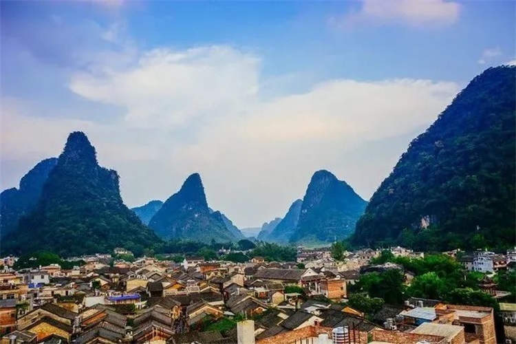 奇峰环绕景色秀丽,兴坪河在此汇流漓江。