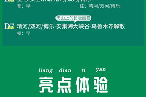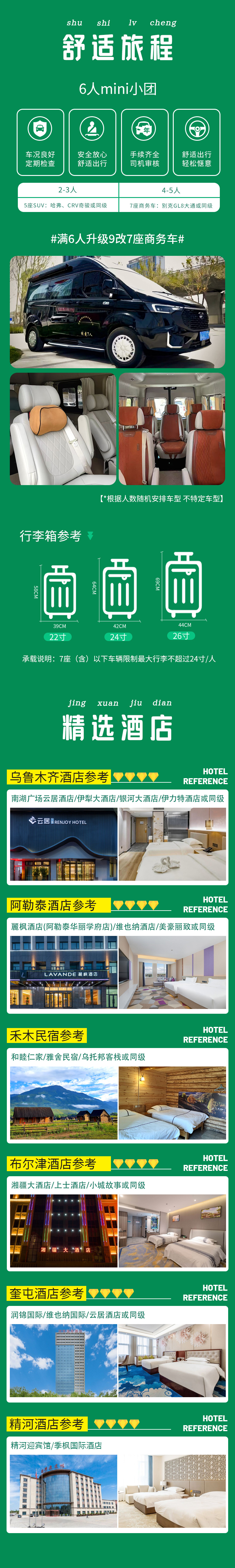 1.2米以下为儿童,含车位费、赠送项目、保险、免门票、酒店免早餐,不含酒店住宿,超高但未满12周岁需补门票410元+早餐费150元(禾木不含早餐),如需占床补床位费2100含早餐。 私家团可升级住宿:轻奢版成人补900/人。 |