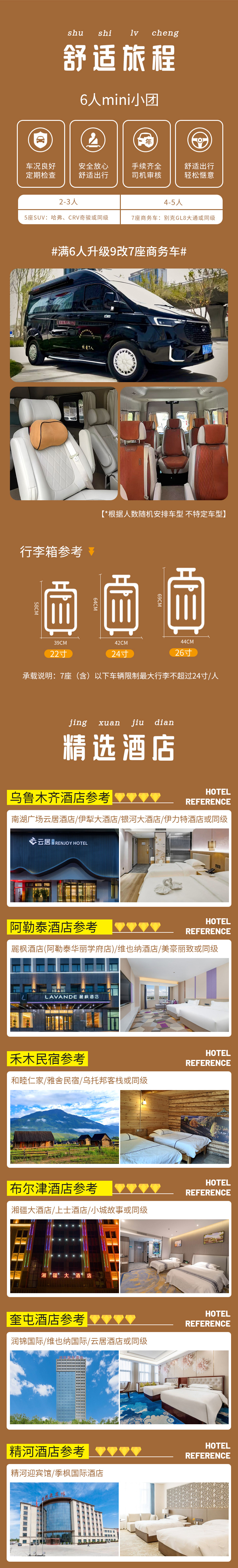 1.2米以下为儿童,含车位费、赠送项目、保险、免门票、免早餐,不含酒店住宿,超高但未满12周岁需补门票375元+早餐费150元(不含禾木早餐),如需占床补2100元床位费。用车安排:2-3人用5座SUV,4-5人用7座商务车,6人用9改7座商务车,7-9人用15座小巴(小团副驾驶及前后座位置需要轮流乘坐,望悉知);10-12人用19座中巴,13-19人用33座大巴,20-28人用车38座大巴;领队安排:10人以下司机管家,10人及以上安排领队+无人机航拍服务。 |