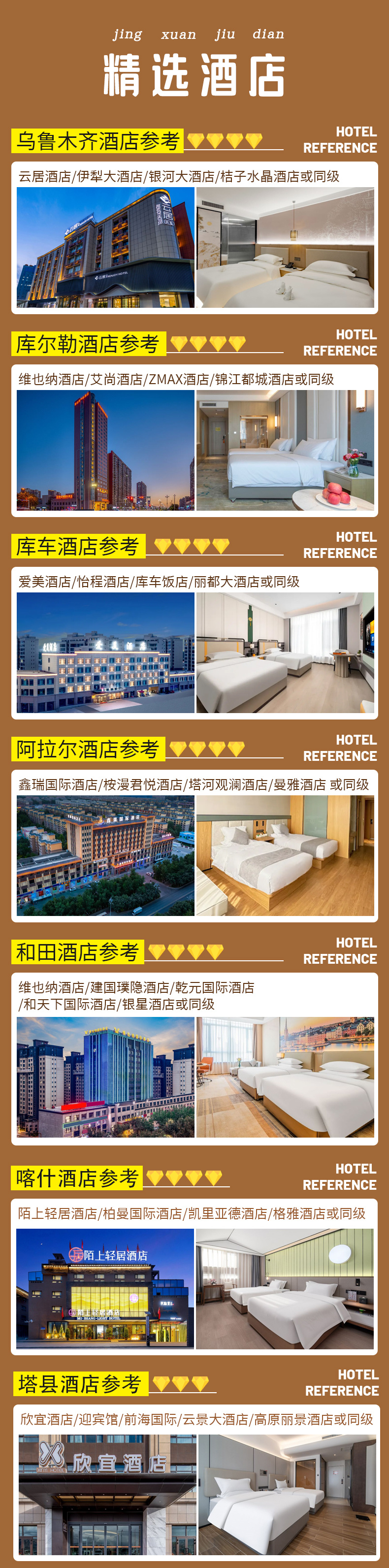 备注:钻级按照携程评级,未挂星,新疆经济较为落后,酒店较南方酒店略差,敬请谅解。