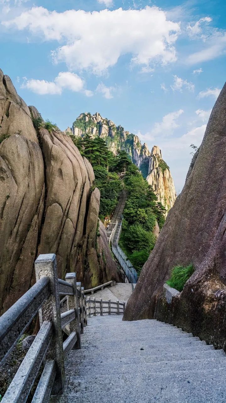 黄山,古称黟山,位于安徽省黄山市境内,黄山集八亿年地质史于一身,融峰林地貌、冰川遗迹于一体,兼有花岗岩造型石、花岗岩洞室、泉潭溪瀑等典型地质景观;前山岩体节理稀疏,多球状风化,山体浑厚壮观;后山岩体节理稠密,多柱状风化,山体峻峭,形成有“前山雄伟、后山秀丽”的地貌特征。远古传说里,这是天帝的居所「天子都」