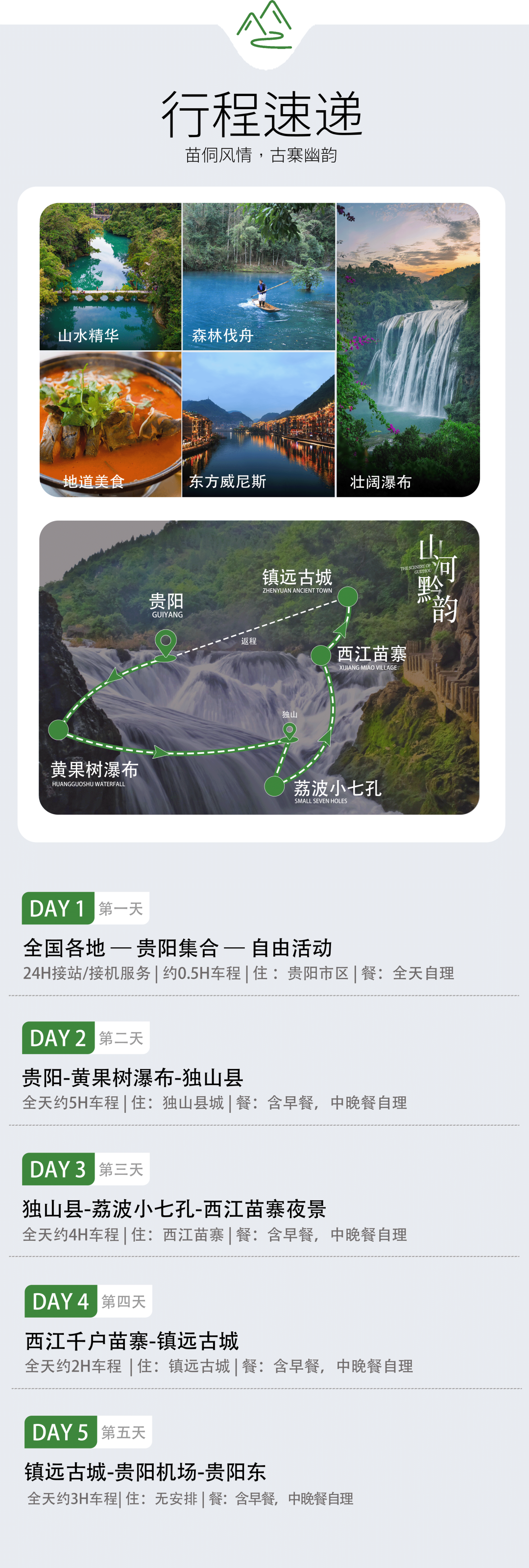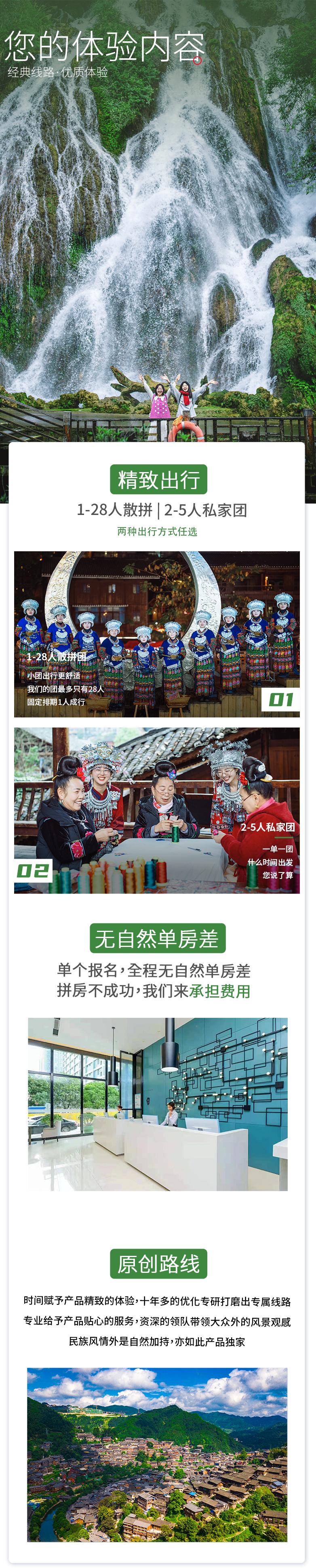 其他:费用包含所未提及的任何形式消费(如:黄果树景区扶梯索道、小七孔鸳鸯湖划船、西江苗寨商业演出、镇远古城内小景点等可自由选择消费项目)