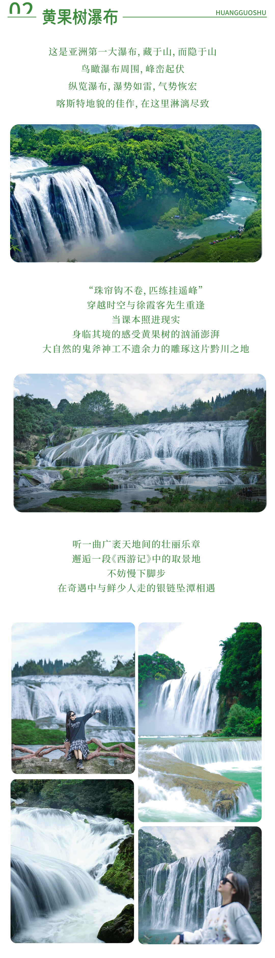 ① 当天游览时间较长且路况以台阶为主,请穿舒适的运动鞋;黄果树景区内餐厅较少,沿途有较多服务区可以简单解决午餐,如个人有特殊要求可自行携带适量干粮食品备用。