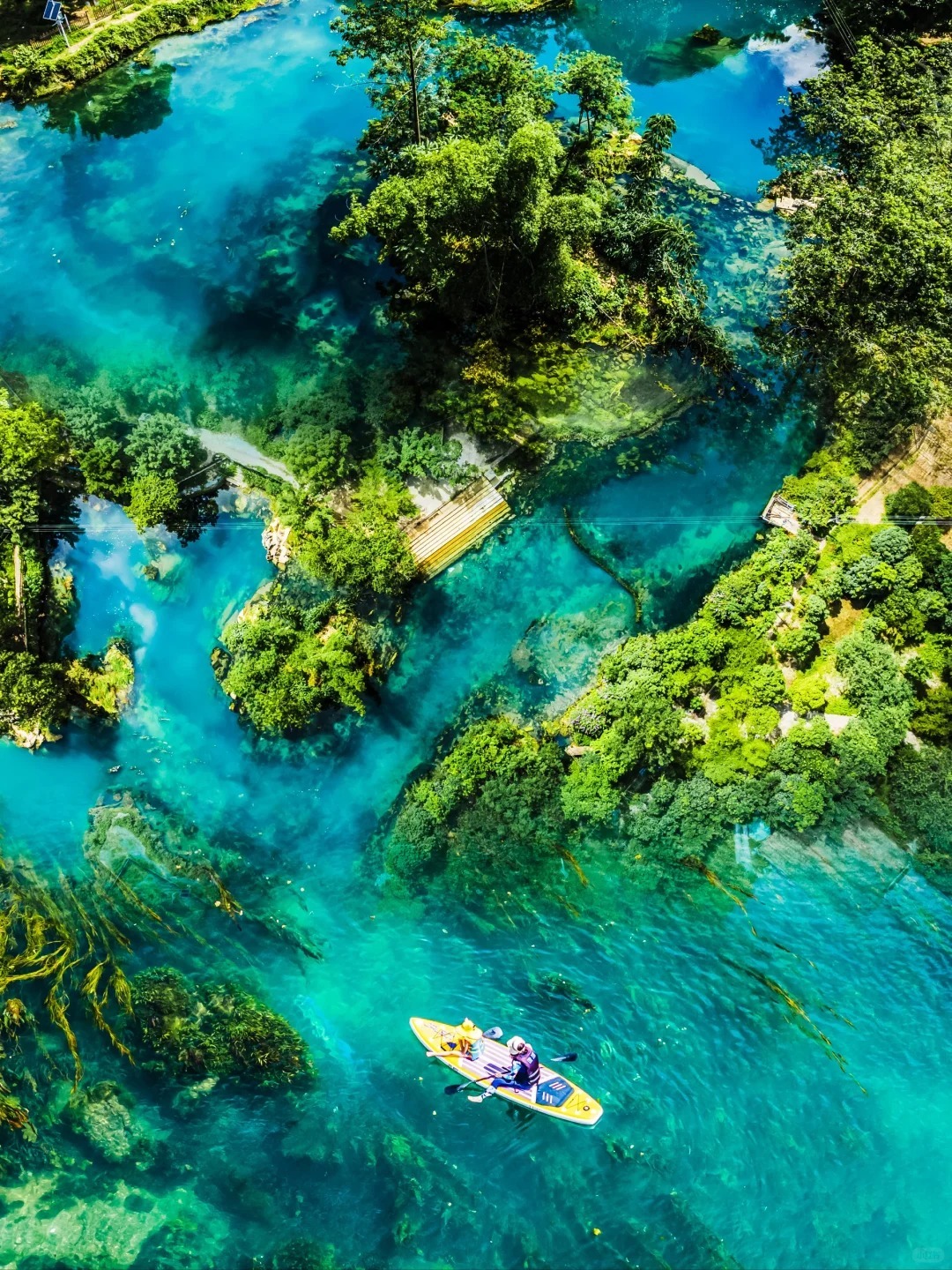 08:30 九顿天窗清澈湛蓝的水,被称为“果冻水”,可以租上一个浆板,近距离感受秀丽的水上风光,还有那在水中摇曳着曼妙身姿的“水下森林”,领队会根据当天情况和当地人确定花开的地方选择游玩