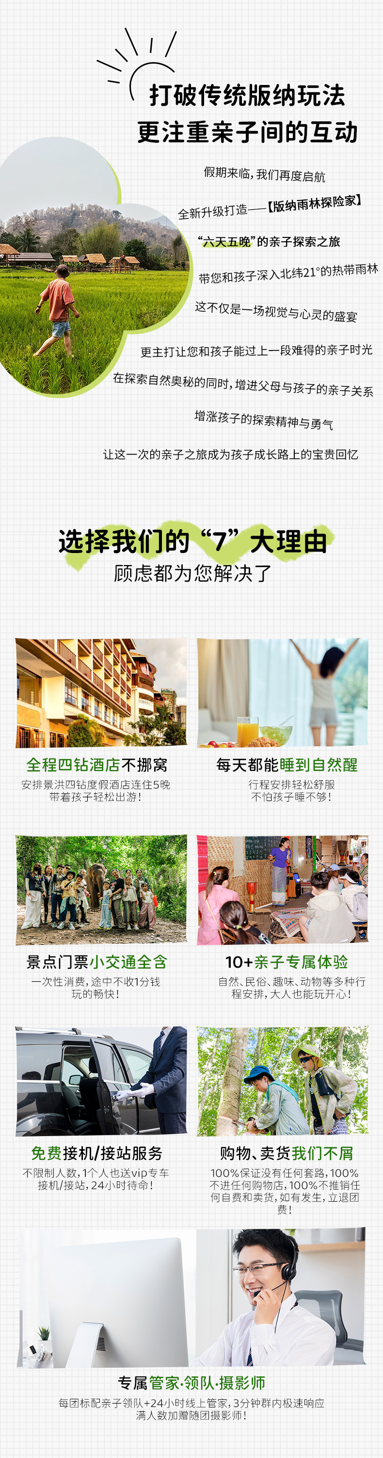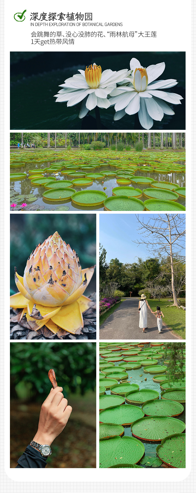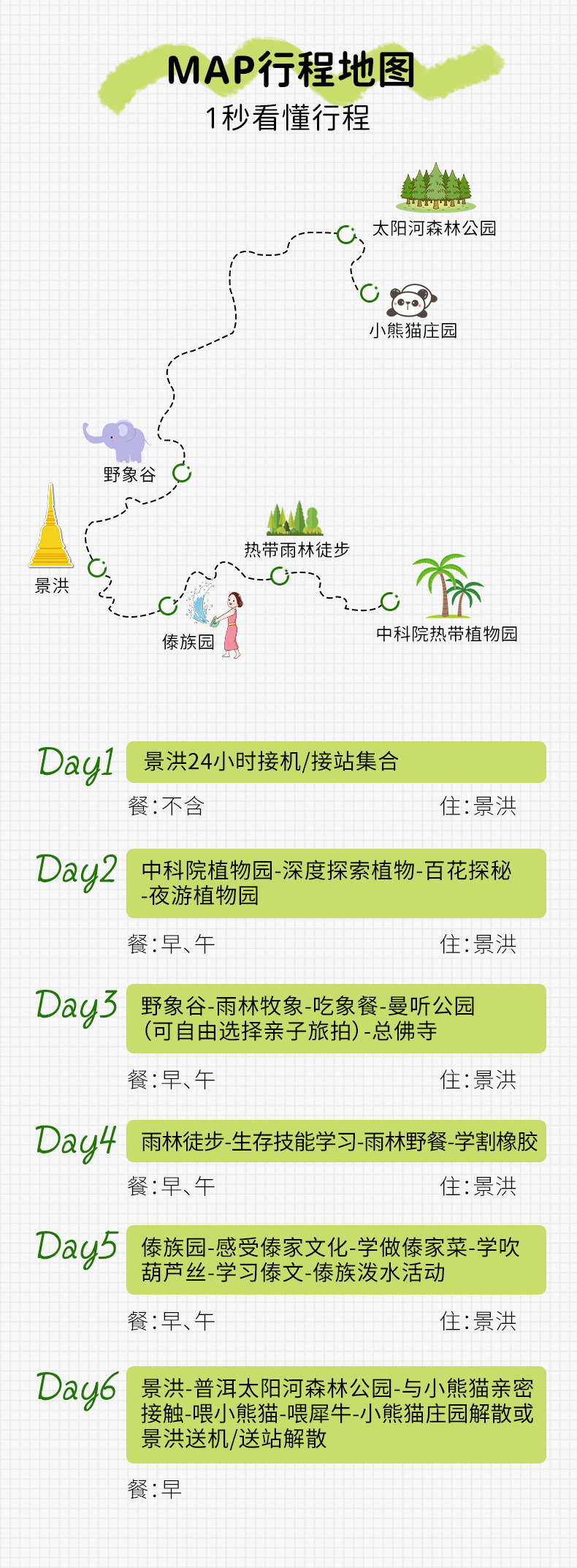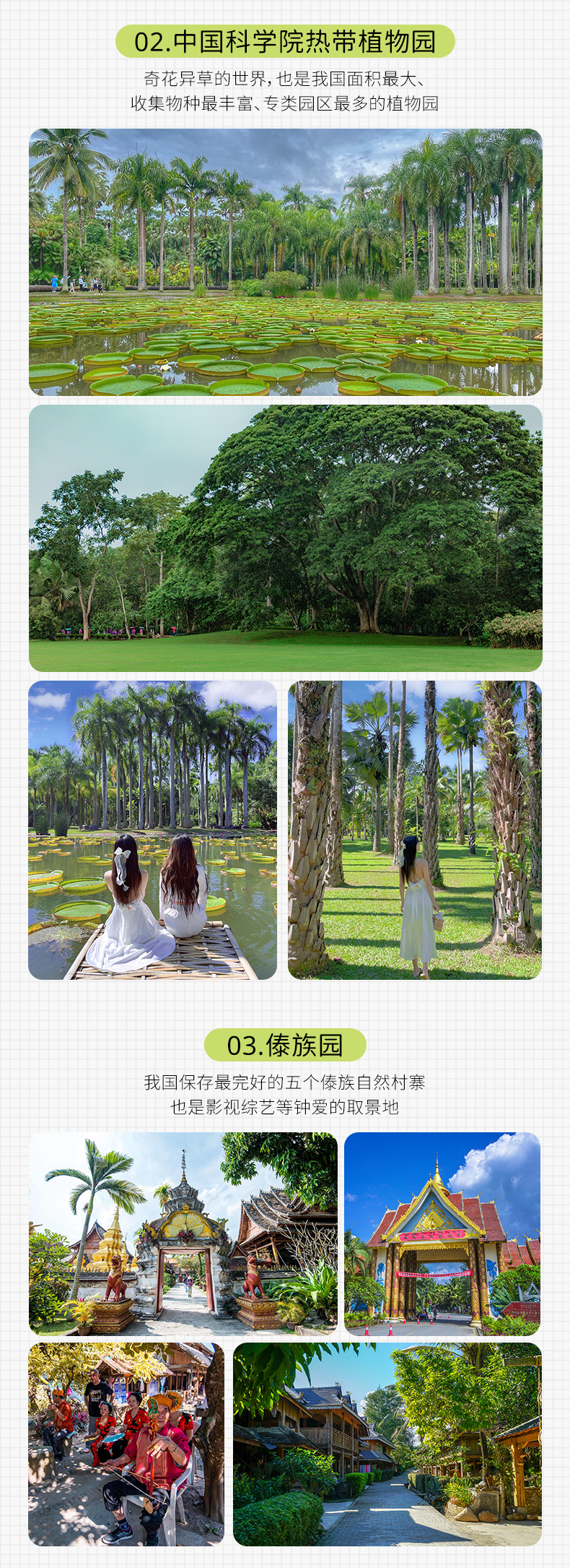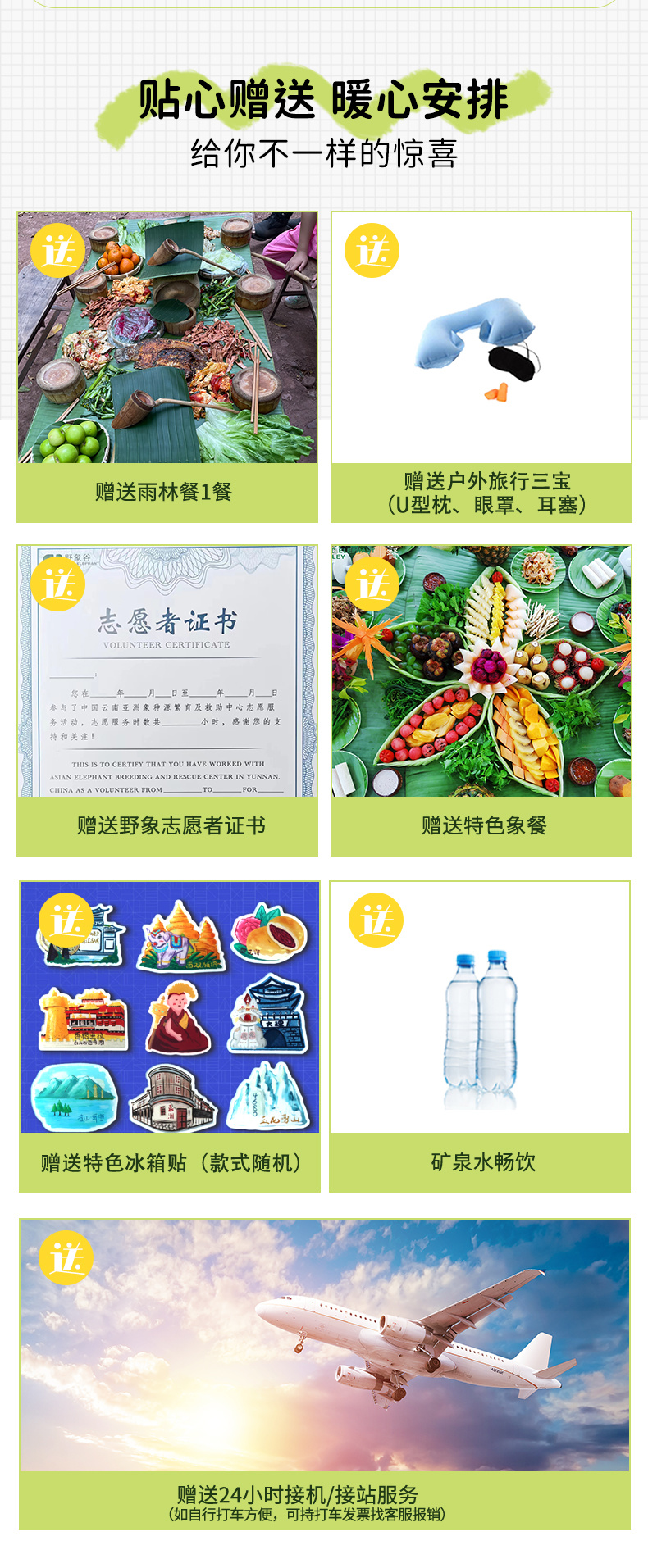 4、门票:中科院植物园(含景交),野象谷,雨林牧象,太阳河森林公园(含景交),原始森林夜游,傣族园(含景交),傣族体验(学做傣家菜+学吹葫芦丝+学习傣文),雨林徒步,曼听公园;