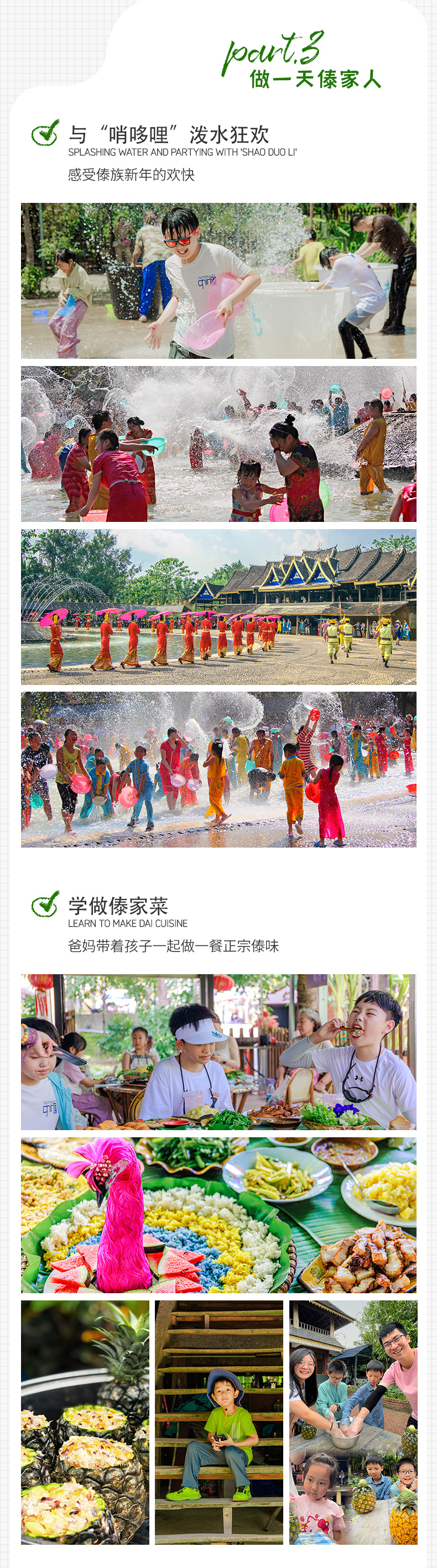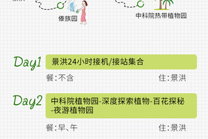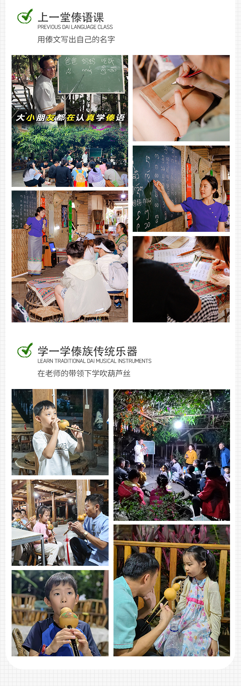 10:00 抵达传统的傣族村寨【西双版纳傣族园】,在这里,孩子将有机会一揽古寨芳华,融入傣家的日常生活,体验那份纯朴与宁静。做一天地道的傣家人,过上同款“向往版”的慢生活,让心灵得到真正的放松与滋养、【逛村寨人文讲解】、【傣味菜制作学习】,在傣族老师的带领下【学习吹葫芦丝】,【学习了解傣族文字】跟着傣族老师学傣语,争取会数数从1-10,写自己的傣文名字,还有等等丰富活动等着大家。
