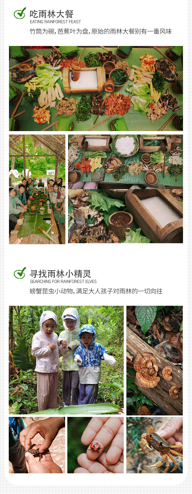 12:30 我们将在原始森林内,体验一次别具一格的【雨林宴】。在热带地区,有一种特别的餐食叫—绿叶宴。沿袭当地丛林先民曾经在丛林用餐的简易且环保的方式,用芭蕉叶等绿色的叶子包裹食物。