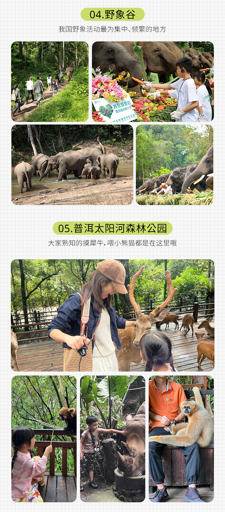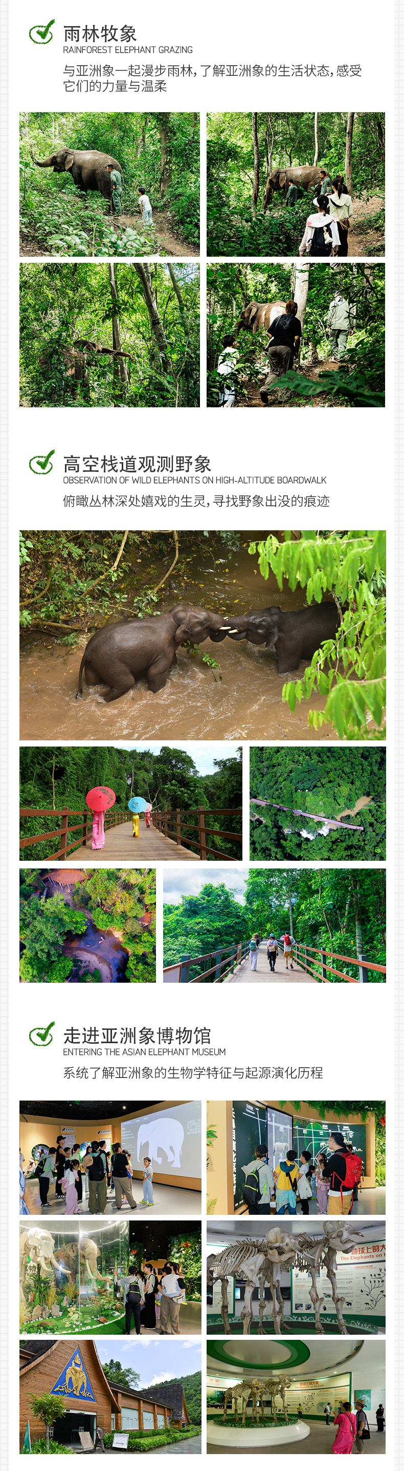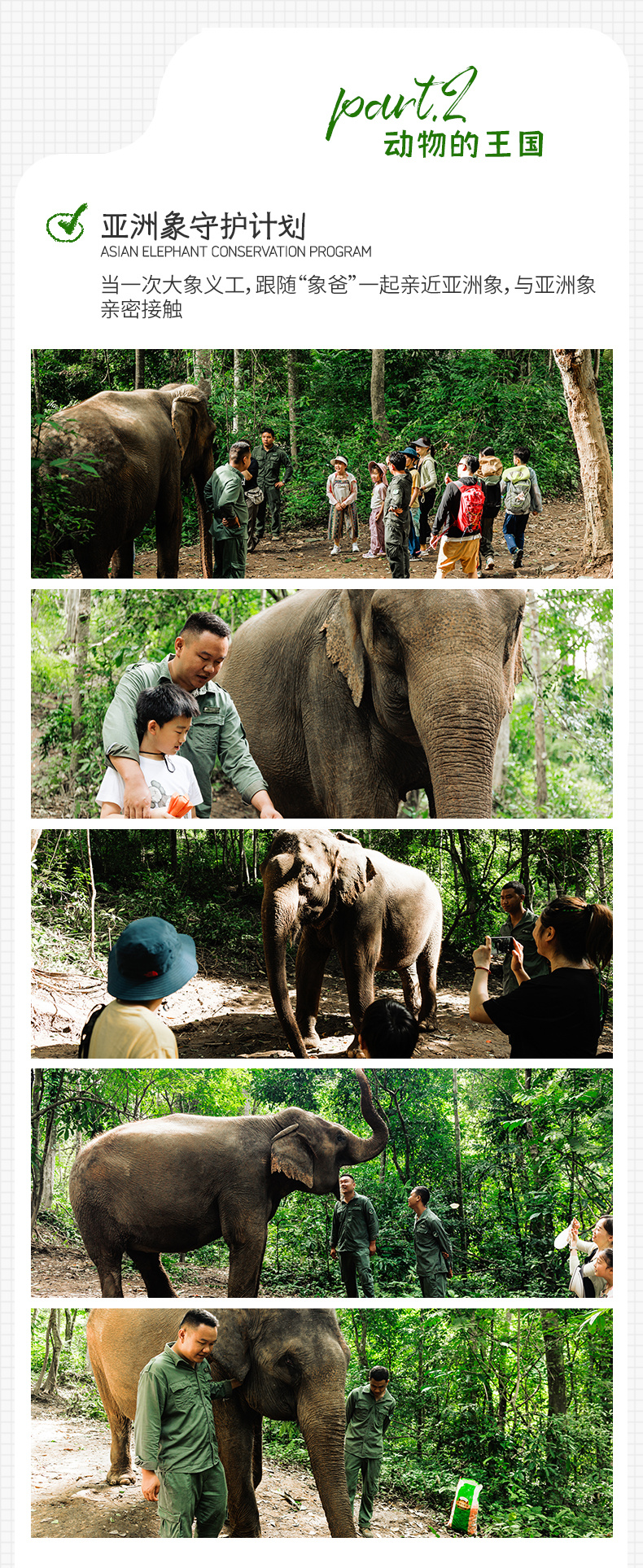 10:00 抵达【野象谷】,今日做一个【亚洲象公益使者】,听象爸爸分享亚洲象专业知识及救助象的日常工作;来一场【雨林牧象】,同象爸爸一起陪大象雨林漫步,听象宝趣事;为大象喂食,在亲密互动中感受守护的力量。