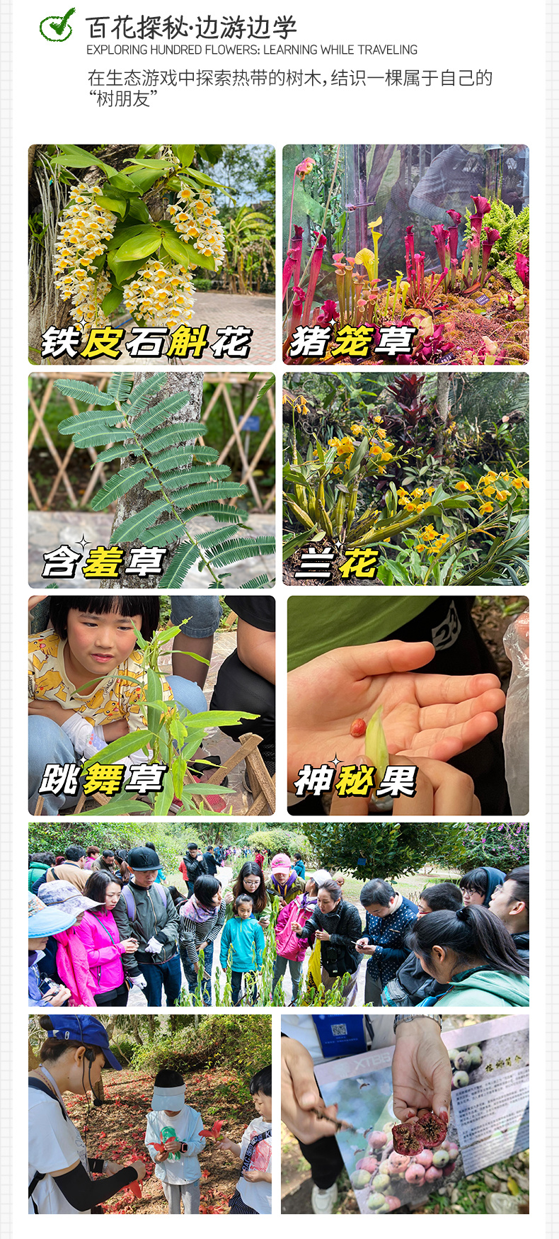 10:00 抵达中科院植物园,在导师的带领下,我们讲开启一场【植物王国的探索】,在科普导游的带领下参观植物园,探寻热带雨林奇观,了解热带雨林的生态系统,结识来自雨林的动植物朋友。开展边游边学活动【百花探秘】,在科普人员带领下,建立营员与版纳植物园的联接,走在植物园特色园区内,观察热带王国的各种奇花异草,认识热带雨林植物及了解它们与气候、水土、环境之间的相互关联。了解西双版纳热带植物园的特点和功能。增进了解,在生态游戏中探索热带的树木,结识一棵属于自己的树朋友。