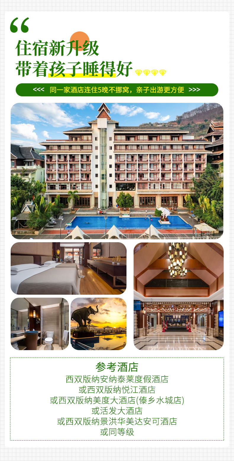 1、住宿:景洪四钻酒店5晚(参考:西双版纳安纳泰莱度假酒店或西双版纳悦江酒店或西双版纳美度大酒店(傣乡水城店)或活发大酒店或西双版纳景洪华美达安可酒店或同等级);