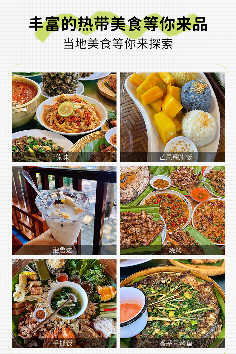 到指定酒店汇合,如果有早到的朋友,可以去市内品尝当地的特色小吃:菠萝饭、手抓饭、撒撇、竹筒饭、傣味包烧、舂鸡脚、香茅草烤鱼。