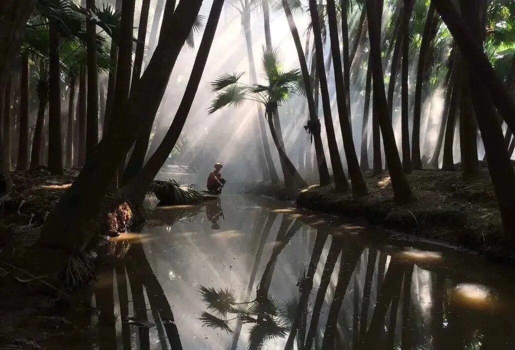 阳光照射错落密布葵树形成了光与影的世界,蒲葵园中不定期会有人工烟雾,就像误入了仙境一般。
