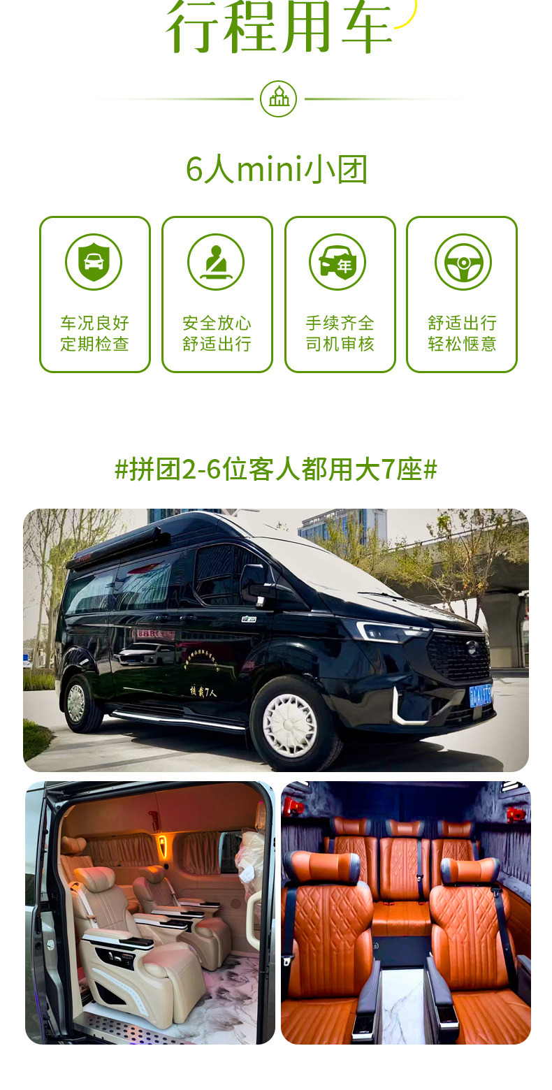 3、用车:2-6位客人拼团用大七座(小团副驾驶及前后座位置需要轮流乘坐,望悉知),私家团2-3位客人用SUV,4-5位客人用7座商务车。