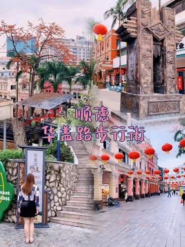 12:00左右华盖路步行街,街道两旁为明末清初骑楼特色的岭南西洋建筑,主色调为粉黄、粉绿、粉蓝。彩色的骑楼,老字号的民信双皮奶店也在此,各类特色小吃众多,大家自由觅食