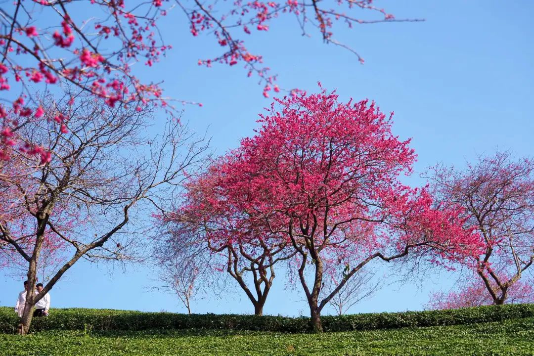 42个樱花品种从1月份就开始次第开放,一直持续到3月。10万株樱花盛开在5万亩的茶园内,被誉为“中国最美樱花圣地”。
