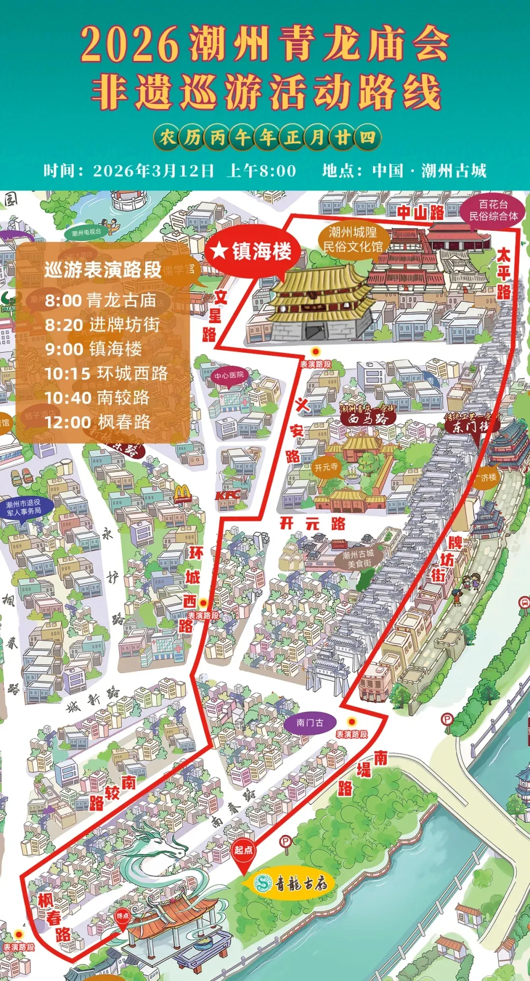 08: 30 古城牌坊街【潮州青龙庙会】是由潮州王伉传统文化研究会主办、香港潮安同乡会协办的大型民俗文化活动,是广东省非物质文化遗产代表性项目 。该庙会于2014年2月14日中断64年后首次恢复,并在农历正月廿四举行巡游活动 。活动以弘扬潮州传统文化及广东省非物质文化遗产为核心,通过文化巡游、民俗展演等形式进行 。巡游队伍由多个篇章方阵组成,展示潮绣标旗、潮州大锣鼓、舞龙舞狮等传统表演 。巡游途经牌坊街、镇海楼等潮州古城地标 。活动吸引美国东方文化联谊会、香港潮属社团总会等众多海内外潮属社团参与,成为联结海内外潮人的平台;