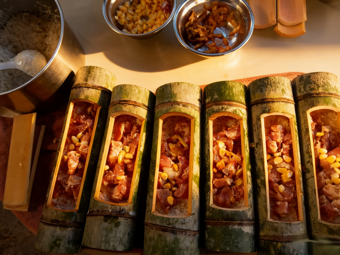 在这里,竹筒饭是不可错过的美味。新鲜砍下的翠竹,清香扑鼻。