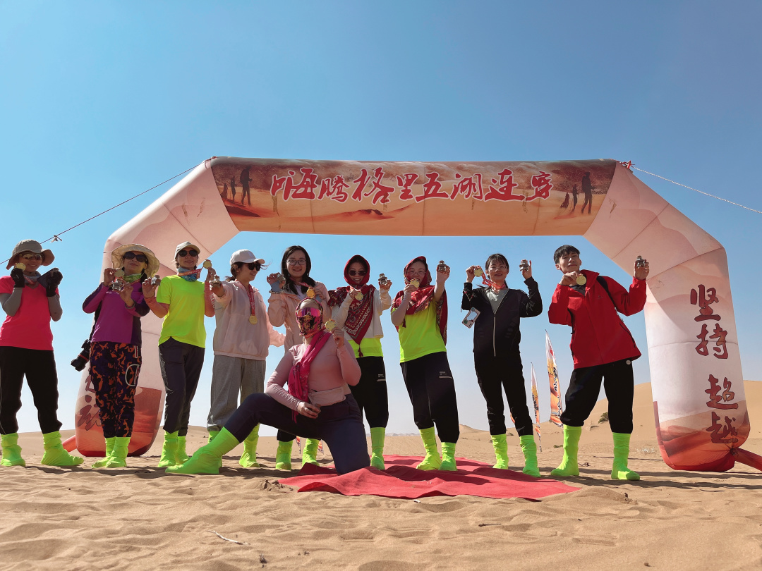 今日沿途可远眺月亮湖(不进入湖内),碧绿湖水、漫漫黄沙、蔚蓝天空在这里交织成一个美妙的画卷,继续行走10公里到达终点! 领队在终点为大家颁发奖牌,集沙瓶,合影留念;午餐过后,大家一起返回银川解散。